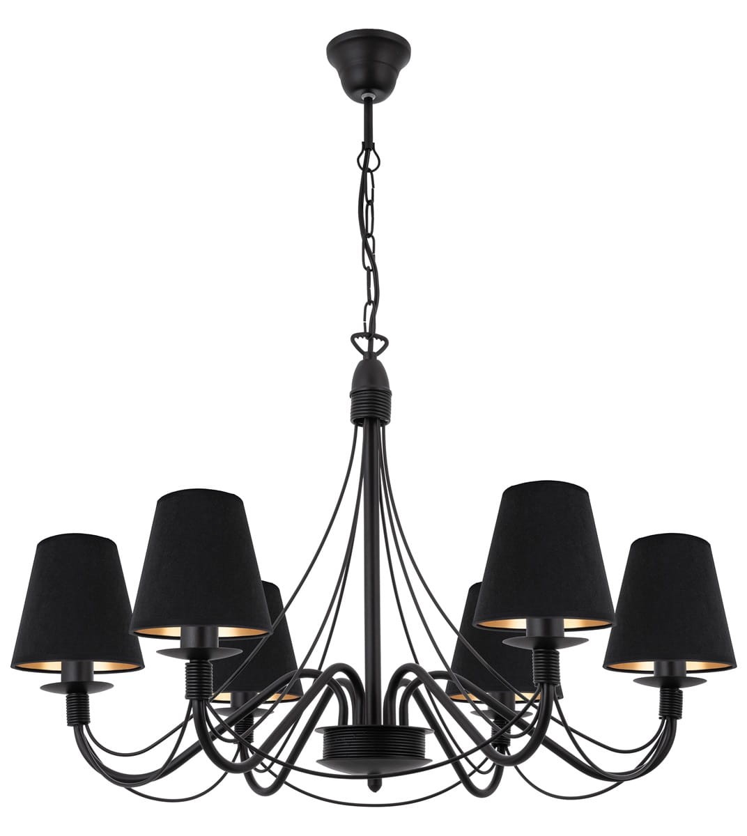 Czarny klasyczny żyrandol z weluru. To niezwykle elegancki 6-ramienny model idealny do klasycznych wnętrz typu kuchnia, czy sypialnia. Eleganckie welurowe abażury ze złotym wnętrzem dają energię ciepłego, miękkiego światła we wnętrzu. Żyrandol o pięknych, smukłych ramionach składających się z cieniutkich drucików w kolorze czarnym, sprawiających wrażenie lekkości. Możesz też dla lepszego dopasowania lampy do swojego wnętrza zmienić kolor abażurów na dowolny z prezentowanych na zdjęciach.