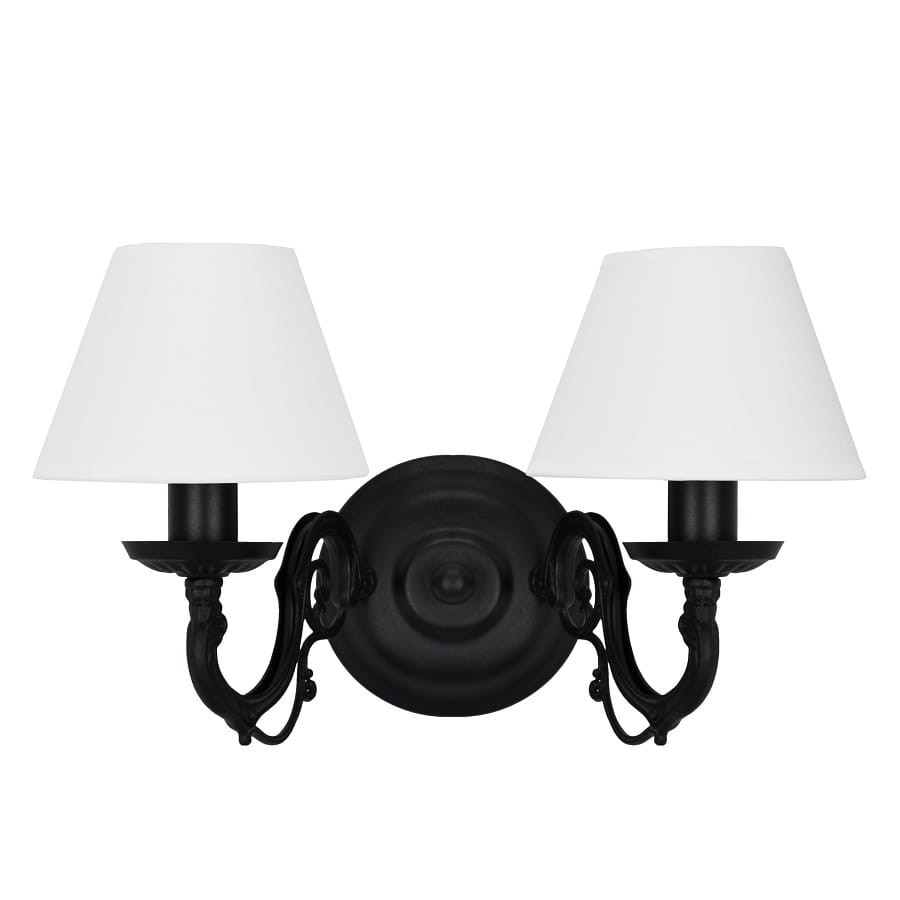 Czarny podwójny kinkiet klasyczny. Bardzo elegancki czarny kinkiet do sypialni lub przedpokoju, który z pewnością spodoba się miłośnikom tradycyjnego oświetlenia. Połączenie czarnego stelaża i białych abażurków to ponadczasowa kompozycja, która pasuje do wielu aranżacji. Kinkiet najwyższej jakości, od polskiego producenta.