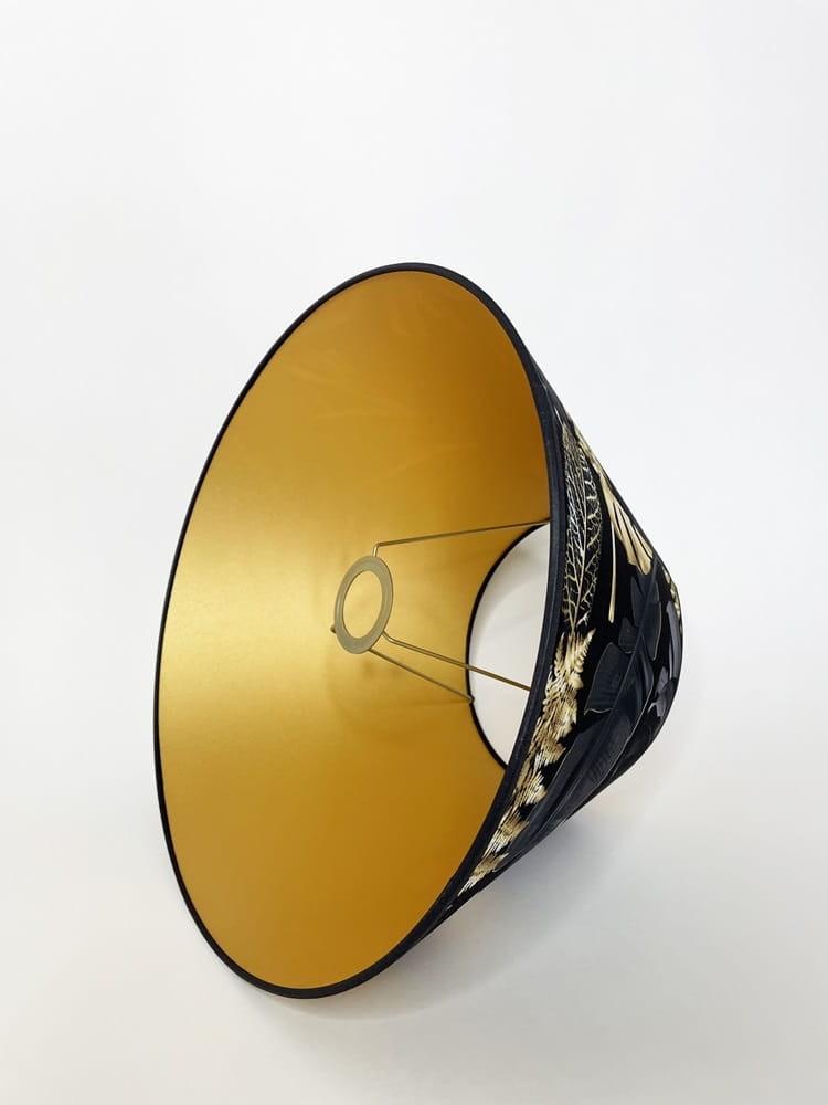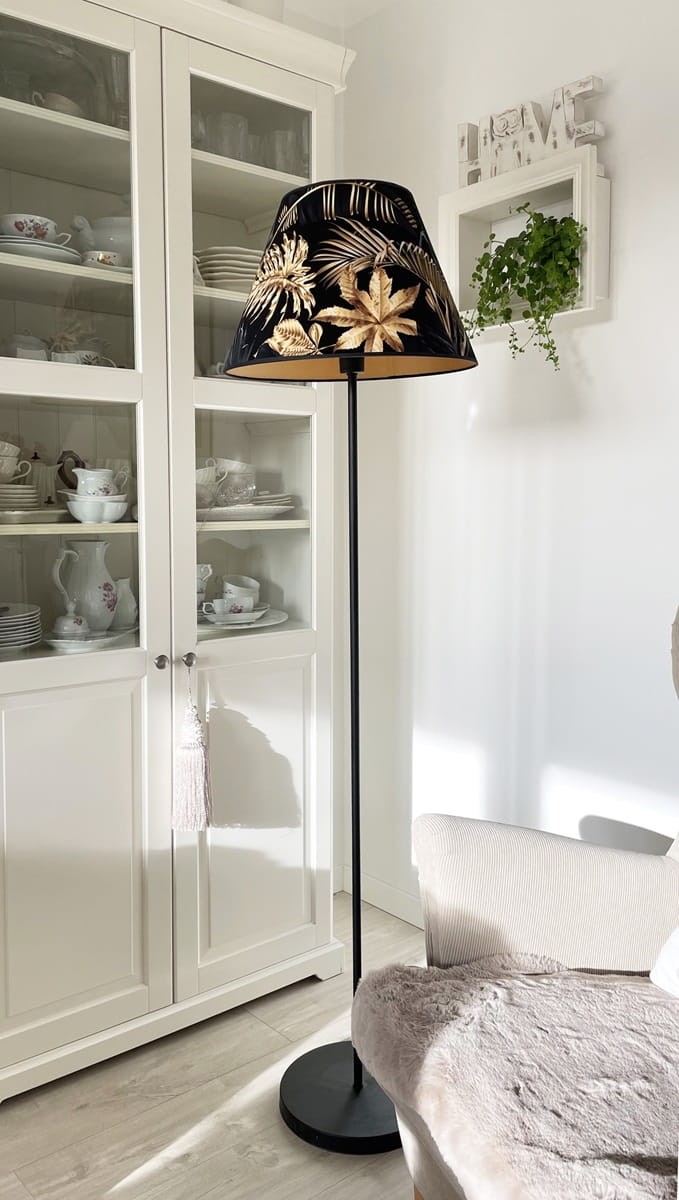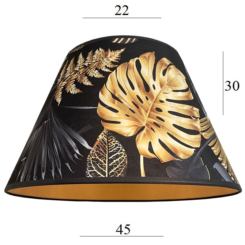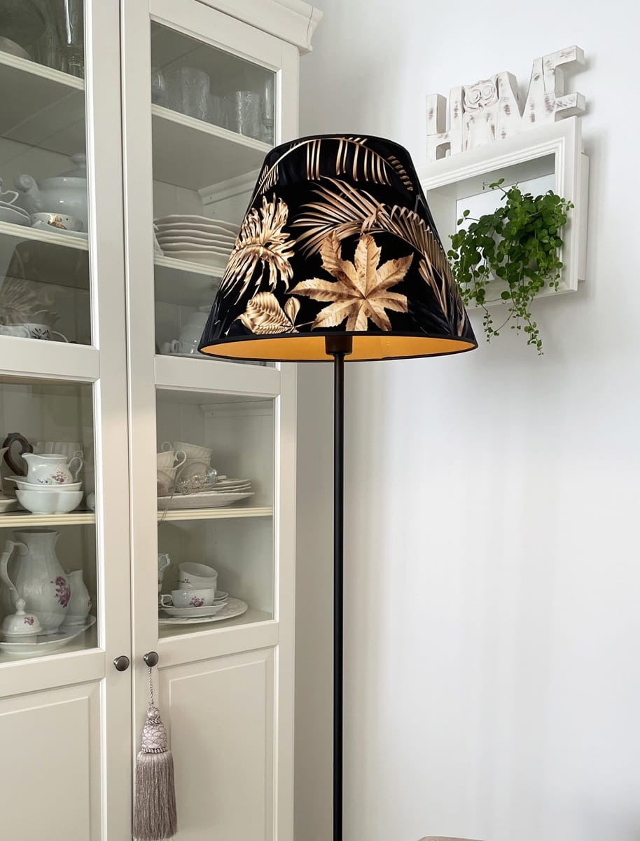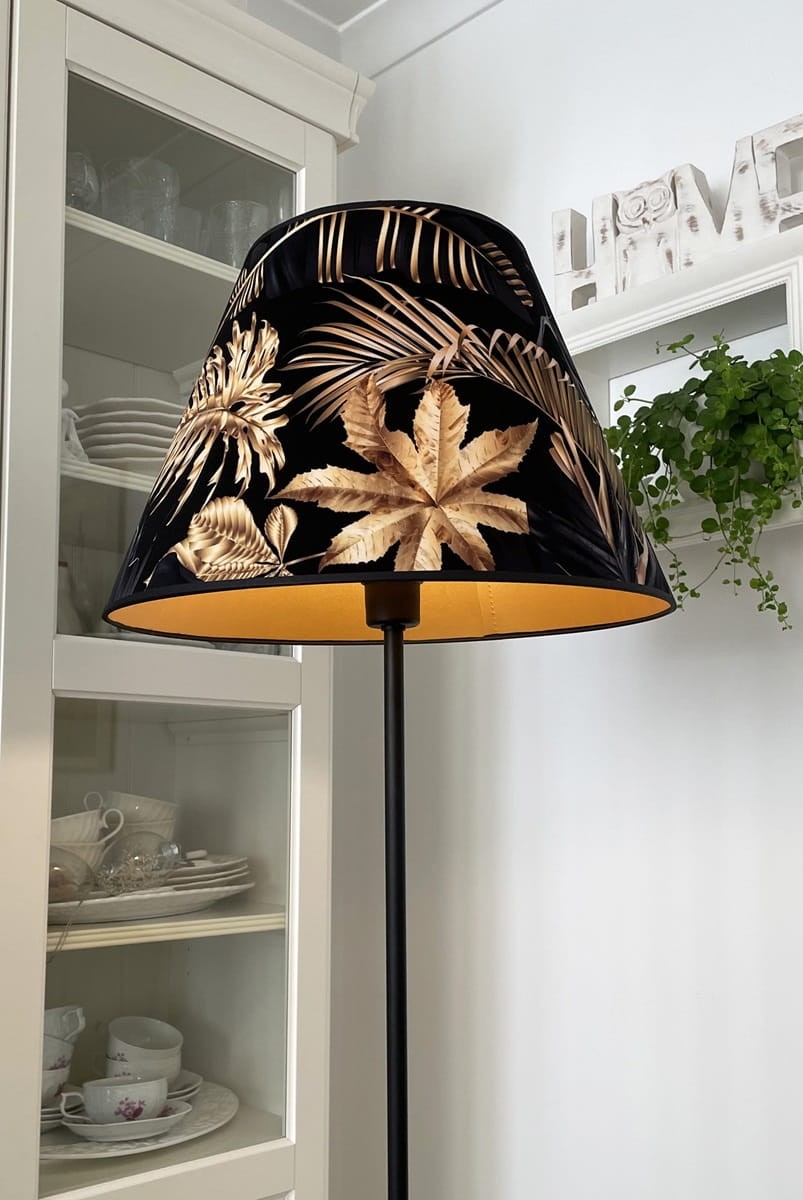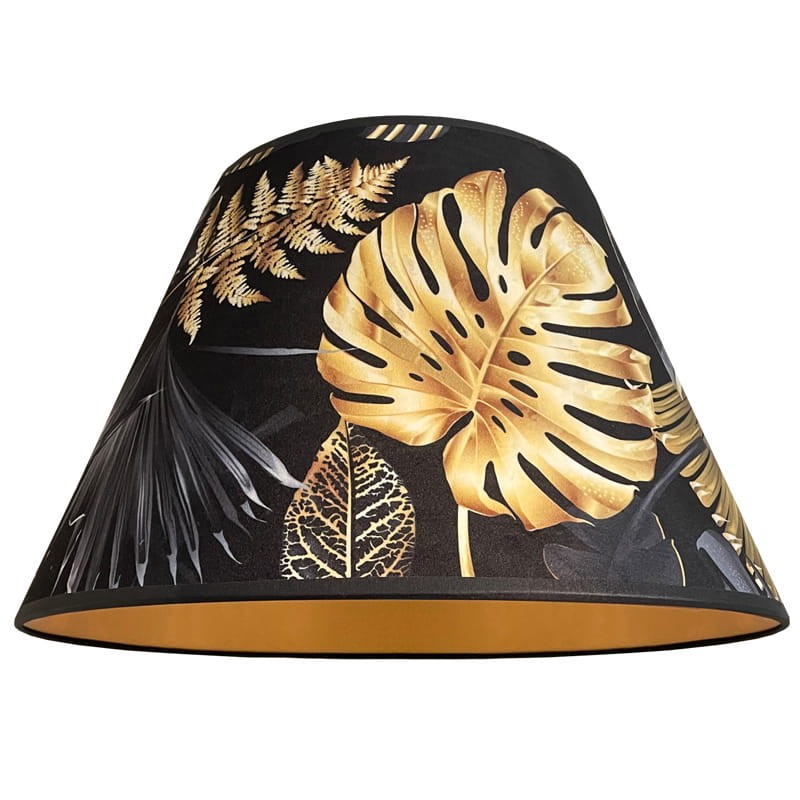 Abażur w kształcie stożka do lampy podłogowej lub dużej lampy stołowej z mocowaniem na oprawkę E27, pięknie wykonany z DELIKATNEGO WELURU podklejonego złotą pleksi. Przepiękne złote liście na czarnym tle zwracają uwagę i stwarzają elegancki klimat we wnętrzu. Abażur doskonale wpisze się w klimat klasycznych wnętrz, nadając im szyku i przytulności.