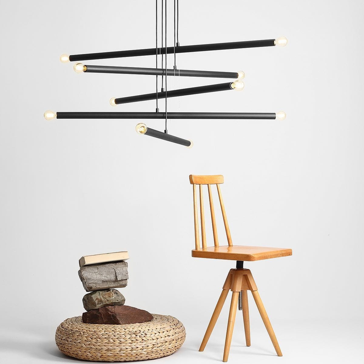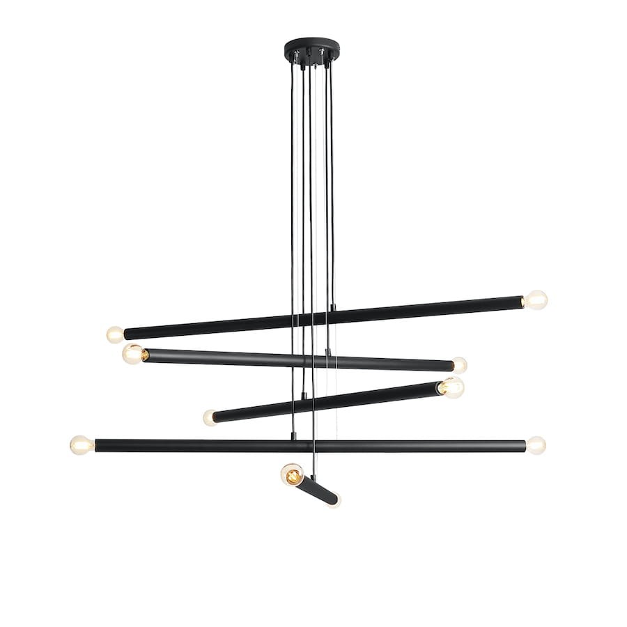 Czarny zwis w stylu minimal dzięki 10 punktom świetlnym świetnie sprawdzi się w roli oświetlenia przestronnych i wysokich pomieszczeń. Klasyczna czerń w połączeniu z niebanalnym designem sprawia, że lampa wisząca TURB jest idealnym uzupełnieniem wnętrza w każdym stylu. Swoją prostotę nasz produkt zawdzięcza 5 tubom, obustronnie zakończonych oprawami żarówek, które zostały wykonane z metalu pokrytego lakierem. Seria lamp TURB dostępna jest też w innym wariantach.