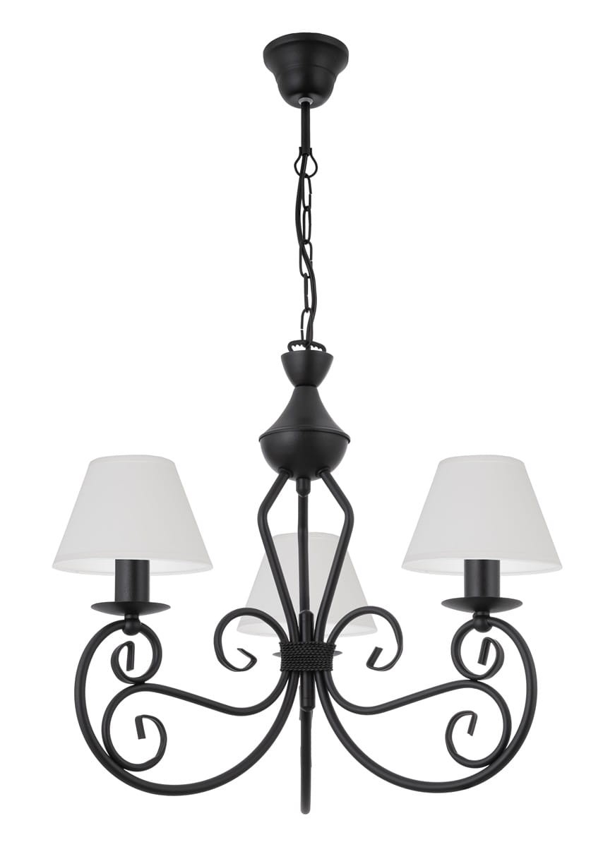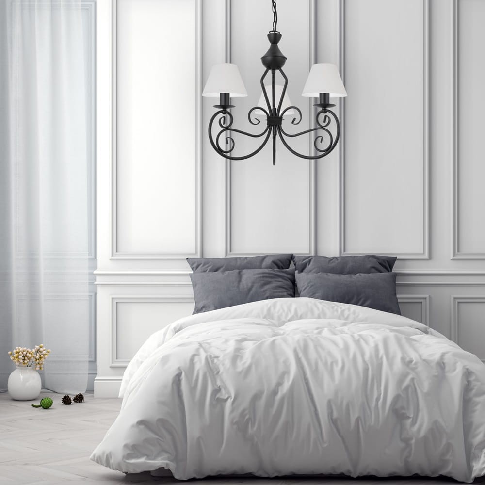 Czarny żyrandol z abażurami do pokoju DALIA 3-płomienny, to piękny, ponadczasowy model dedykowany do klasycznych wnętrz typu niewielki pokój, czy sypialnia. Możesz go powiesić również w nowoczesnych wnętrzach, będzie pięknie "przełamywał" styl, wprowadzając nieco ciepłego, eleganckiego looku. Żyrandol o pięknych ramionach składających się z finezyjnie wygiętych rureczek, które zostały wykończone małymi, białymi abażurkami. Możesz też dla lepszego dopasowania lampy do swojego wnętrza zmienić tkaninę abażurów na dowolną z palety poniżej.
