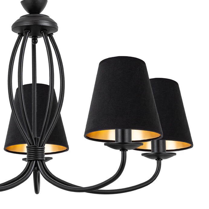 Czarny żyrandol do salonu z czarno-złotymi abażurami OLIVER to stylowa lampa sufitowa z czarnym, stalowym stelażem i welurowymi abażurami w tym samym kolorze. Połączenie tych elementów nadaje jej elegancki i klasyczny wygląd. To idealna propozycja do salonu, sypialni lub holu, gdzie lampa podkreśli charakter wnętrza i doda mu wyrazistości.