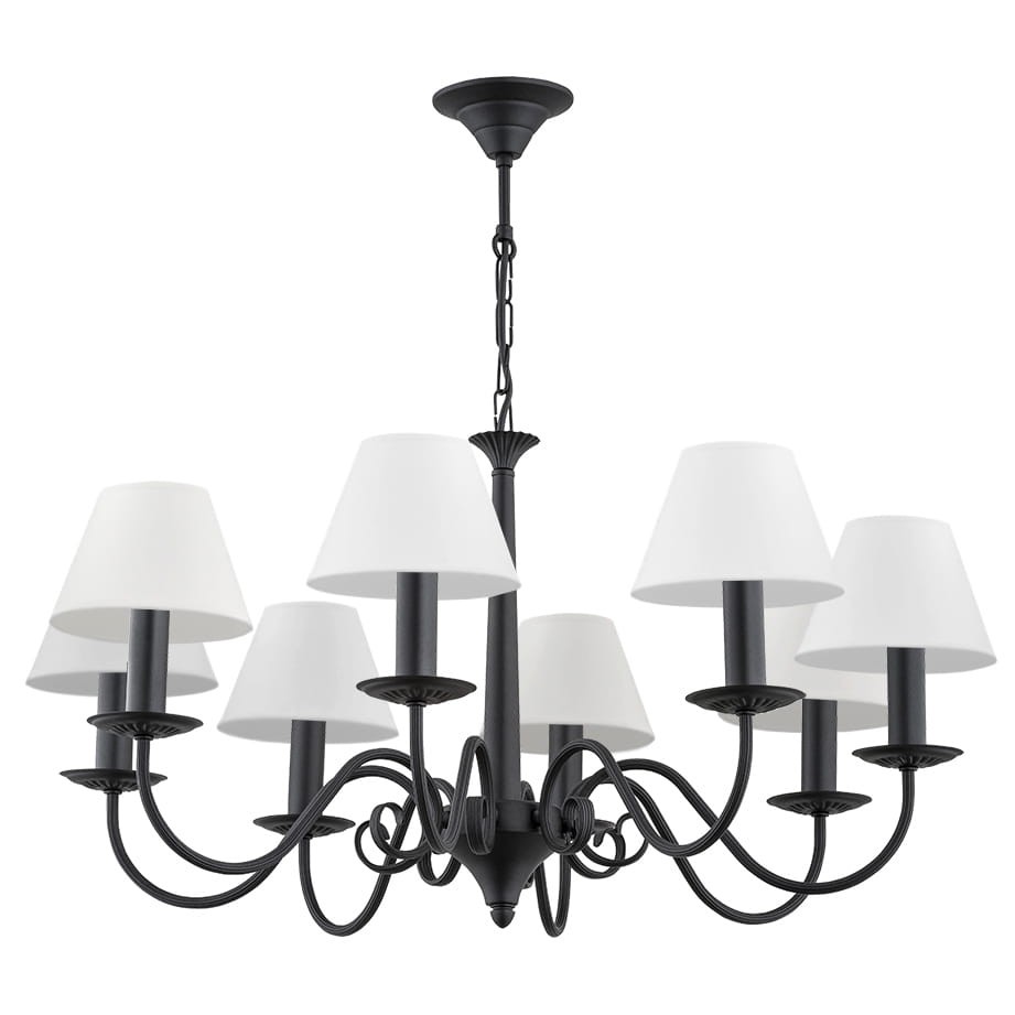 Czarny żyrandol klasyczny do salonu. Model 8-ramienny z białymi, tkaninowymi abażurami 1S, które wykonano z certyfikowanej tkaniny.