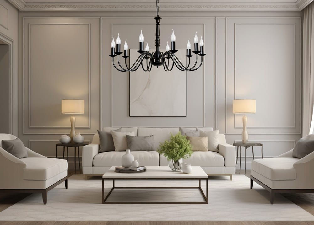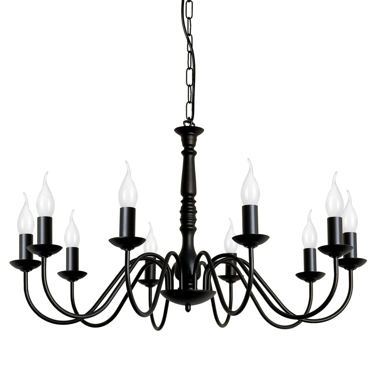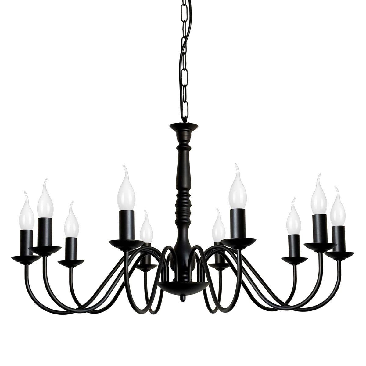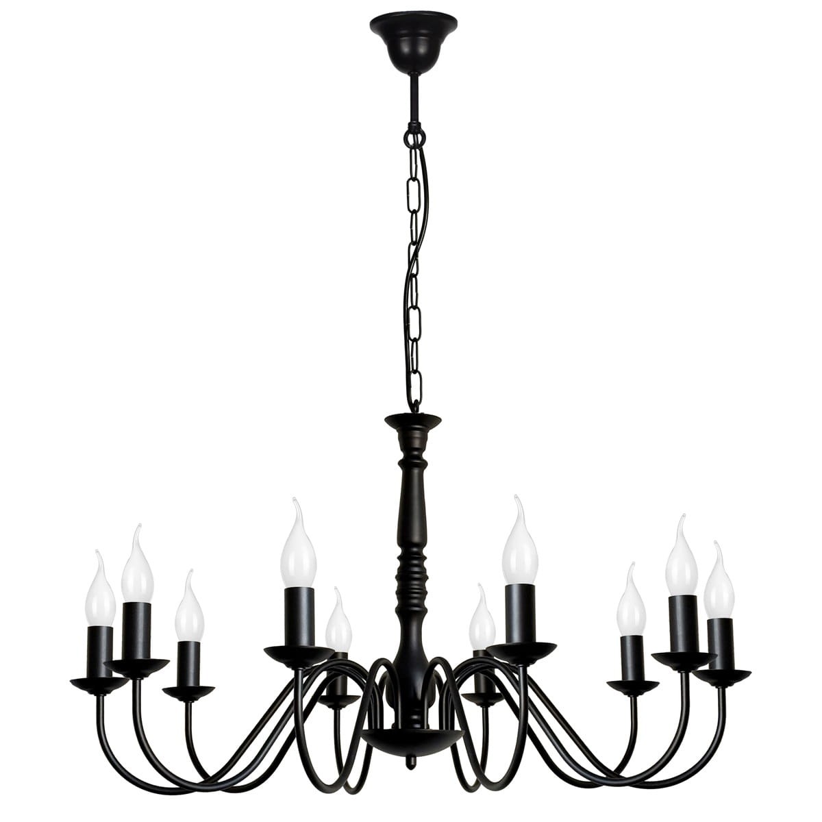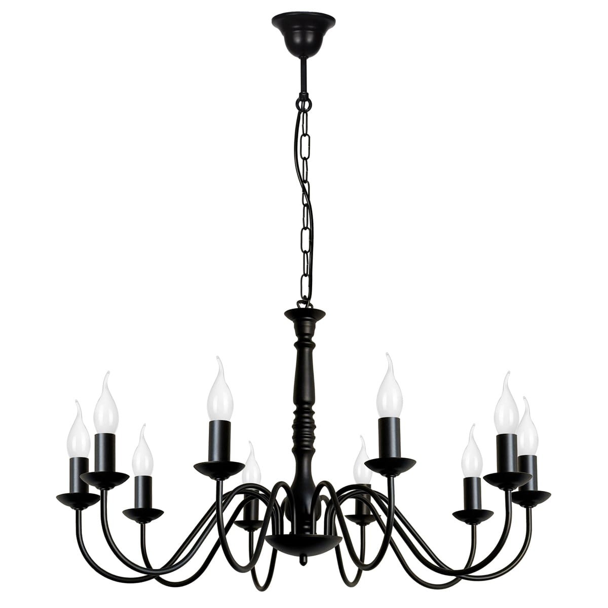 Czarny żyrandol z 10 ramionami JASMIN to przepiękny model klasycznej lampy świecznikowej. Niezwykle elegancki i ponadczasowy doda klasy każdemu wnętrzu. Piękny, zdobiony środek i 10 kształtnych ramion tworzą niepowtarzalną całość, która zwraca uwagę już od wejścia do pomieszczenia. Klasyczna czerń dodaje mu głębi i stylu. Ten duży żyrandol to propozycja do przestronnych salonów, restauracji, a nawet kościołów.