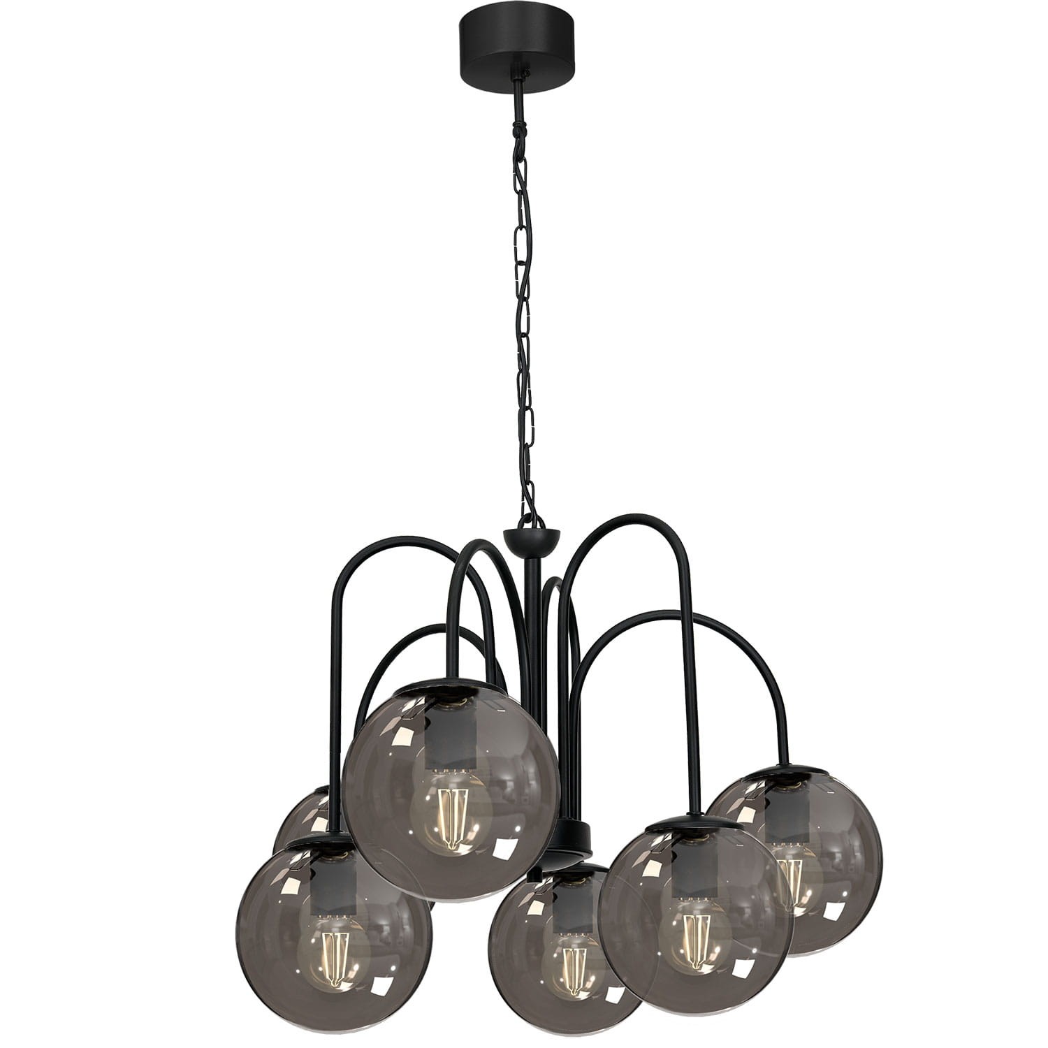 Czarny żyrandol z efektownymi kloszami. Oryginalny ciekawie zaprojektowany duży żyrandol. Na czarnej metalowej konstrukcji w zestawie z sześcioma unikatowymi przydymionymi kloszami świetnie doświetli takie wnętrze jak salon, jadalnia czy sypialnia. Produkt polski.