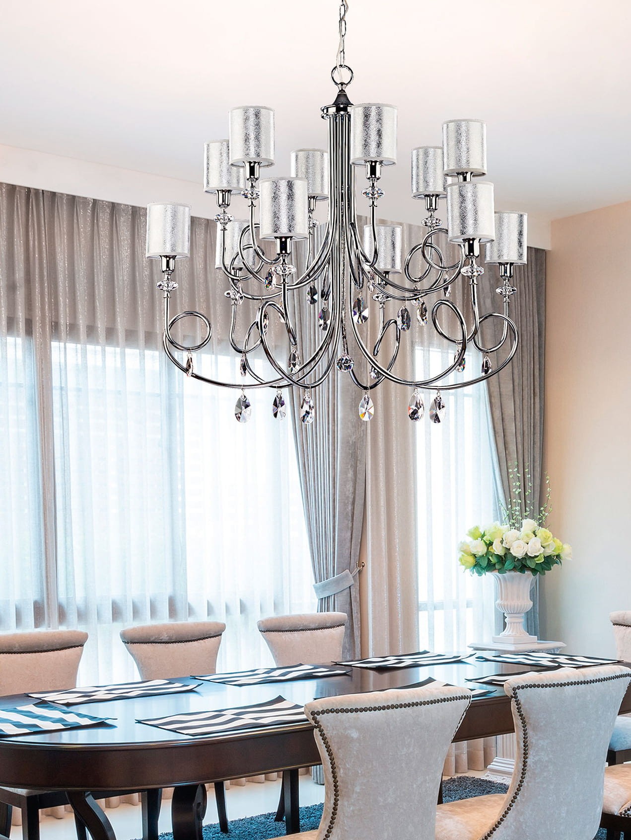 Elegancki żyrandol z abażurkami oraz kryształkami.
