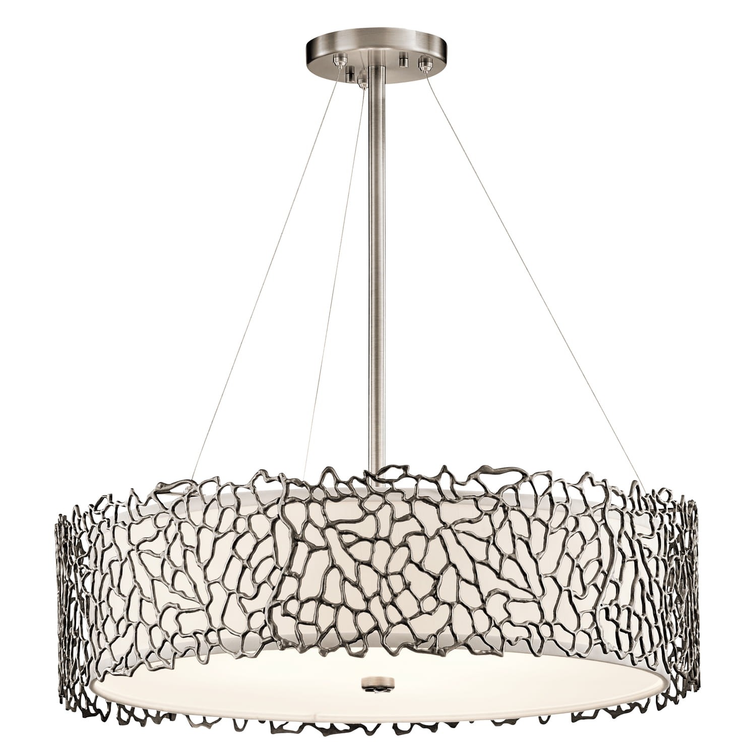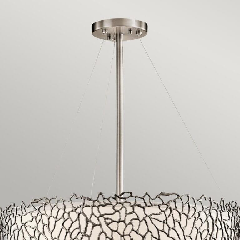 Dizajnerska lampa wisząca do salonu w kolorze srebrnym. Duża lampa SILK COBRA to połączenie nowoczesności i wyjątkowego dizajnu. Wygląda niczym od projektanta, zwraca uwagę misternością wykonania i ażurowym kloszem wykonanym ze srebrnego metalu. Idealna do powieszenia w salonie, sypialni, czy w jadalni. Produkt najwyższej jakości.