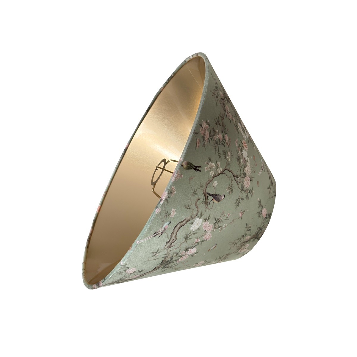 | Materiał | Podstawa lampy: ceramika w kolorze BIAŁYM JEDNOLITYM, metalowa oprawka żarówki w kolorze złotym z regulacją kąta nachylenia. Abażur z tkaniny welurowej SIENA, w kolorze delikatnej, zgaszonej zieleni z gałązkami i ptaszkami, od spodu złota folia. |