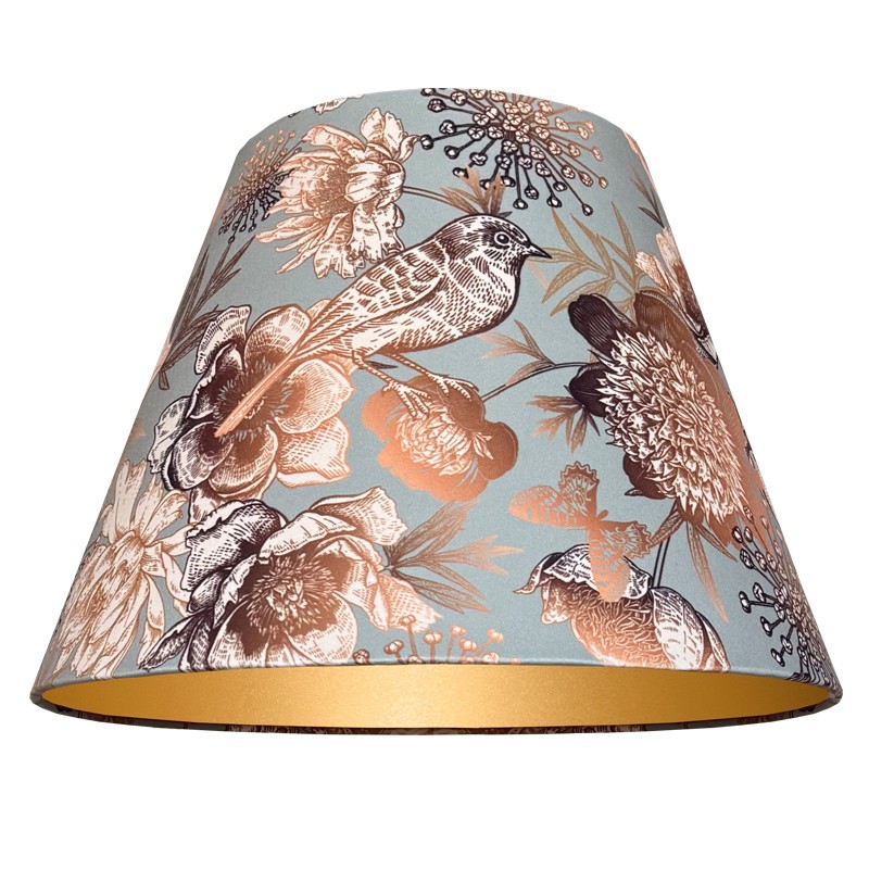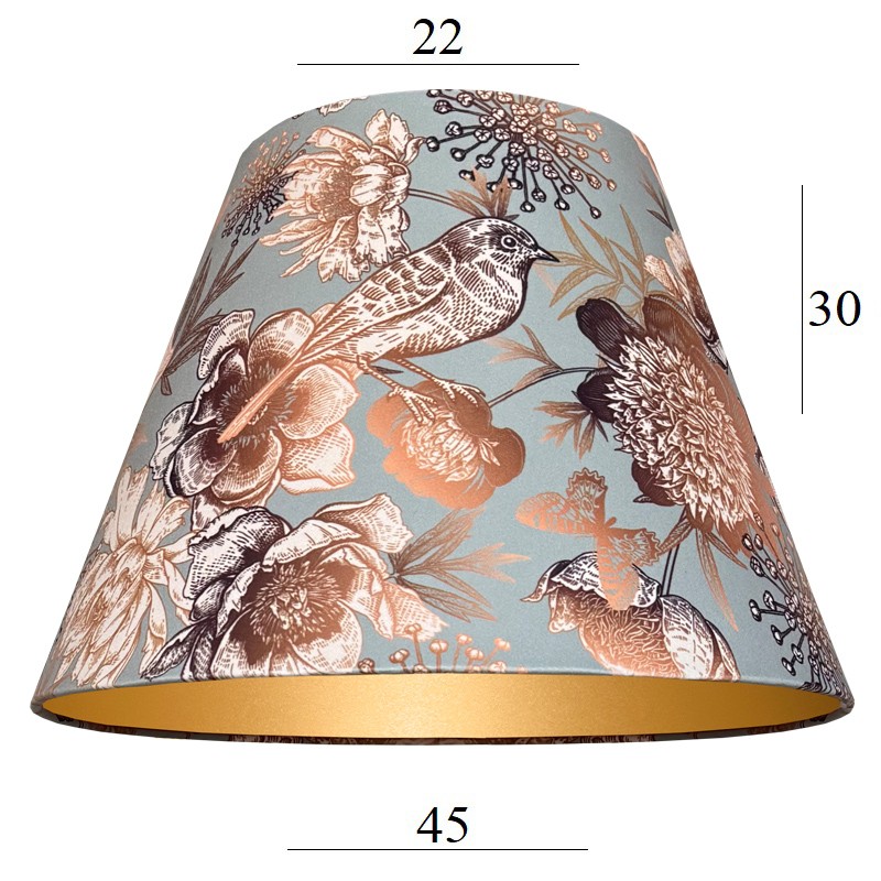Duży abażur do lampy podłogowej z weluru w złote kwiaty. Przepiękny, delikatny kwiatowy, złoty wzór na tle w kolorze niebiesko-zielonym zwraca uwagę i stwarza romantyczny nastrój we wnętrzu, złote wnętrze pięknie odbija światło nadając mu ciepły odcień. Abażur doskonale wpisze się w klimat klasycznych i prowansalskich wnętrz, nadając im szyku i przytulności.