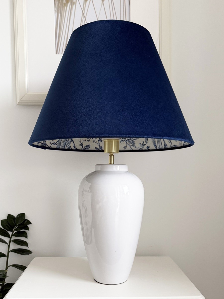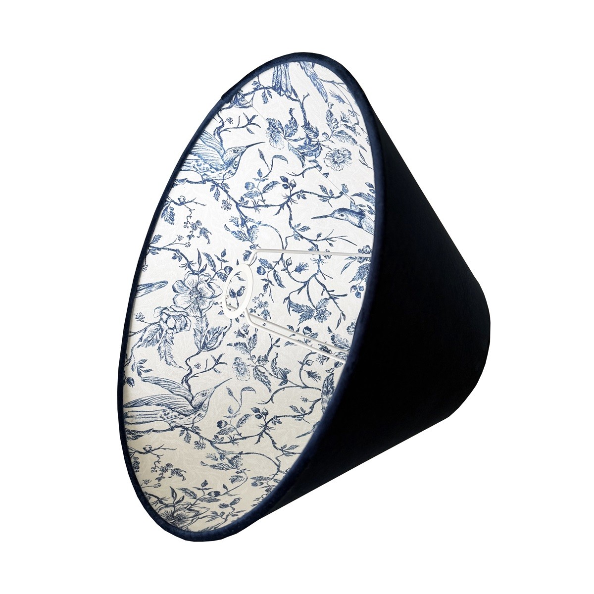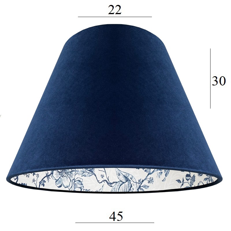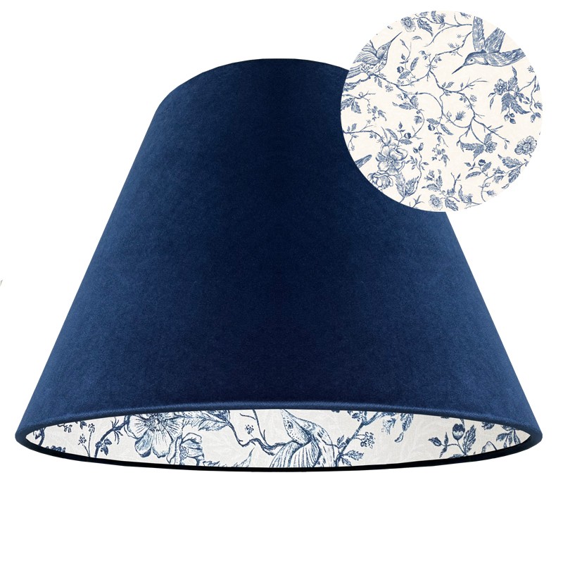 Duży abażur stożek z granatowego aksamitu, to idealna propozycja do klasycznych wnętrz. Przepiękna, delikatna, aksamitna tkanina idealnie współgra z jasną tkaniną wewnątrz abażura z niebieskim wzorem kwiatów oraz ptaszków. Abażur ręcznie wykonany z dbałością o każdy szczegół odmieni wygląd każdej lampy stojącej lub dużej lampy stołowej.