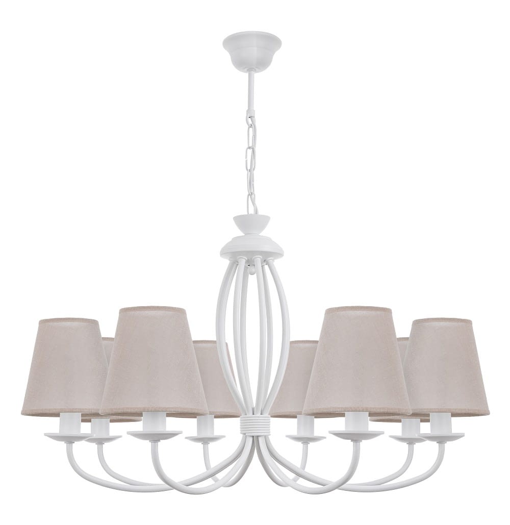 Duży stylowy biały żyrandol OLIVER 8-ramienny. Idealnie pasuje do jasnych wnętrz jak również do klasycznych salonów i pokoi. Aby jeszcze piękniej wkomponować lampę do wnętrza można bezpłatnie zmienić kolor abażurów.