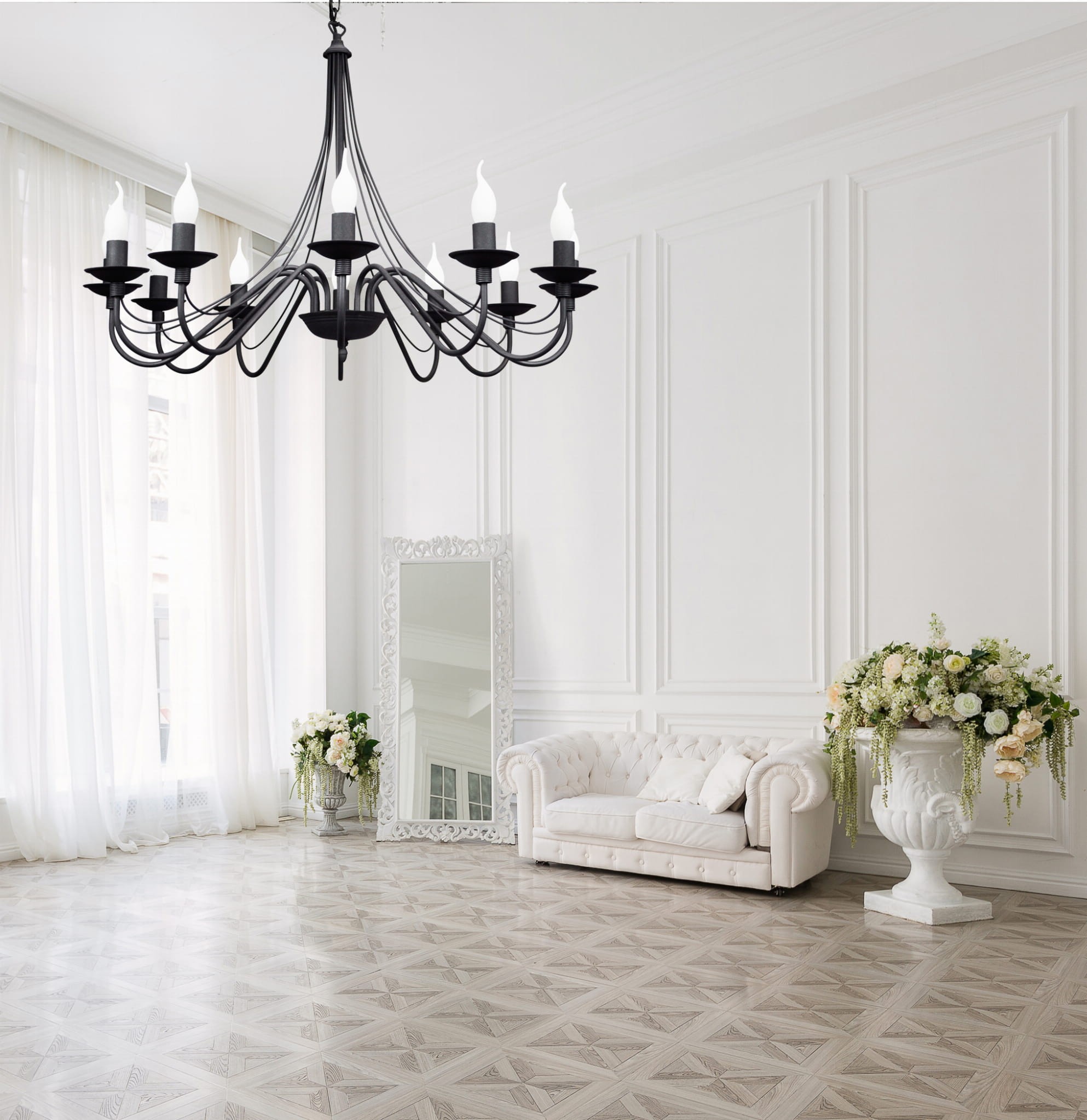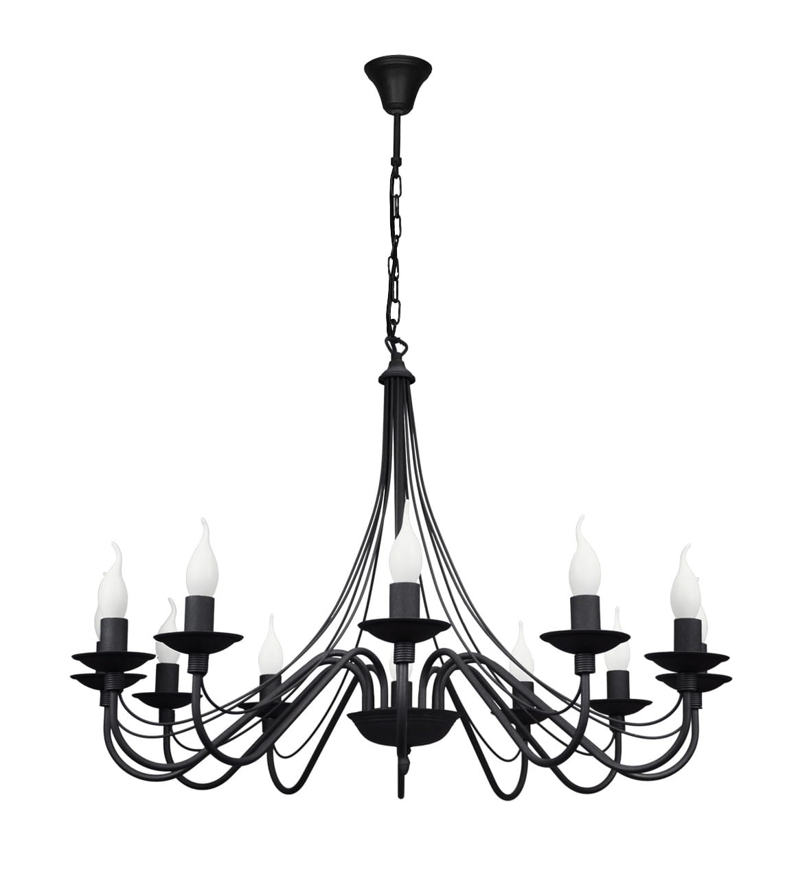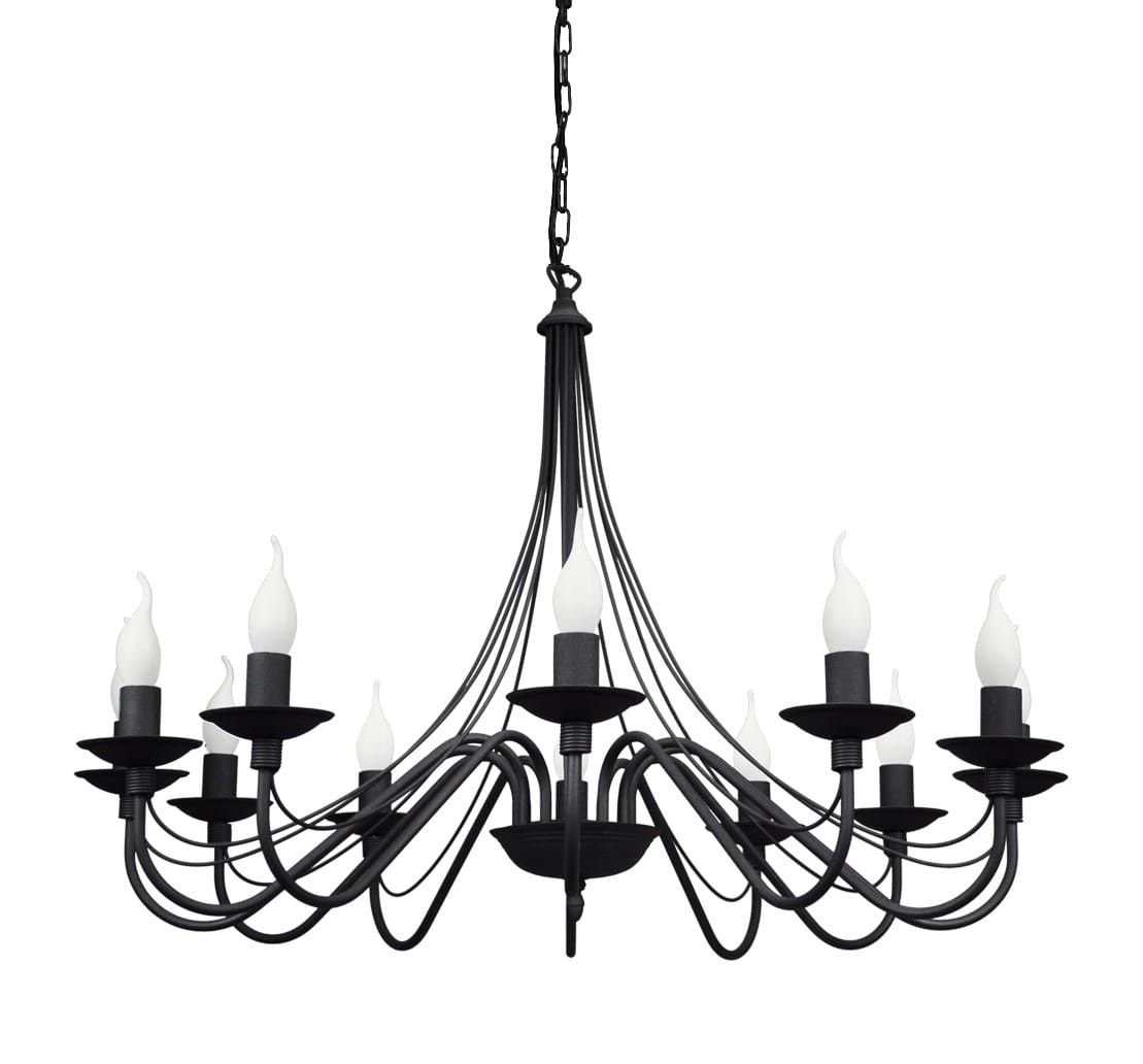 Duży żyrandol 12-ramienny wzorowany na dawnych kutych żyrandolach będzie idealnym dopełnieniem zarówno mieszkań jak również restauracji czy sal balowych. Wspaniała lampa wisząca zrobi duże wrażenie i wypełni wnętrze blaskiem.