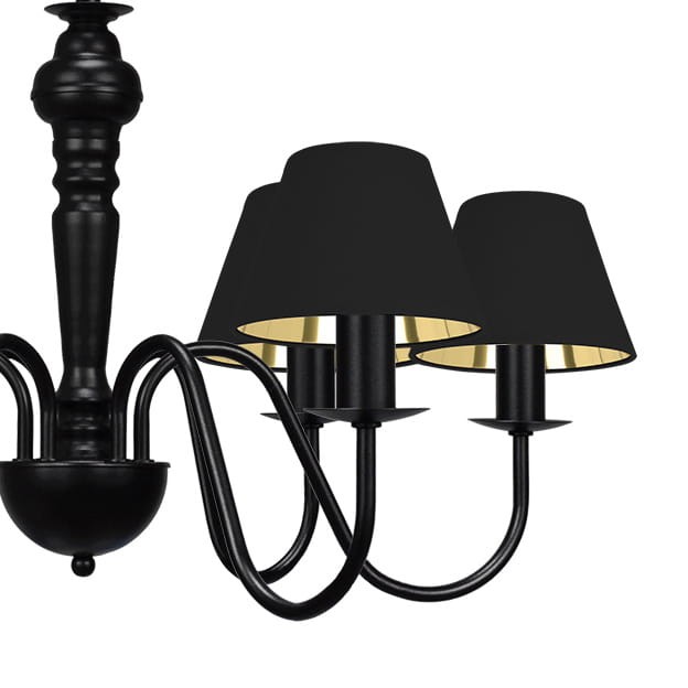Dworkowy żyrandol z czarno-złotymi abażurami GOLDSUN. Lampa w stylu dworkowym z sześcioma ramionami i czarnymi abażurami ze złotym wnętrzem to elegancka propozycja dla miłośników klasyki z nutą nowoczesności. Kontrast między matową czernią a połyskującym złotem tworzy wyrazisty, ale ciepły efekt świetlny. Żyrandol doskonale sprawdzi się w przestronnych wnętrzach - salonach, jadalniach czy holach, gdzie stanie się stylowym punktem centralnym aranżacji.