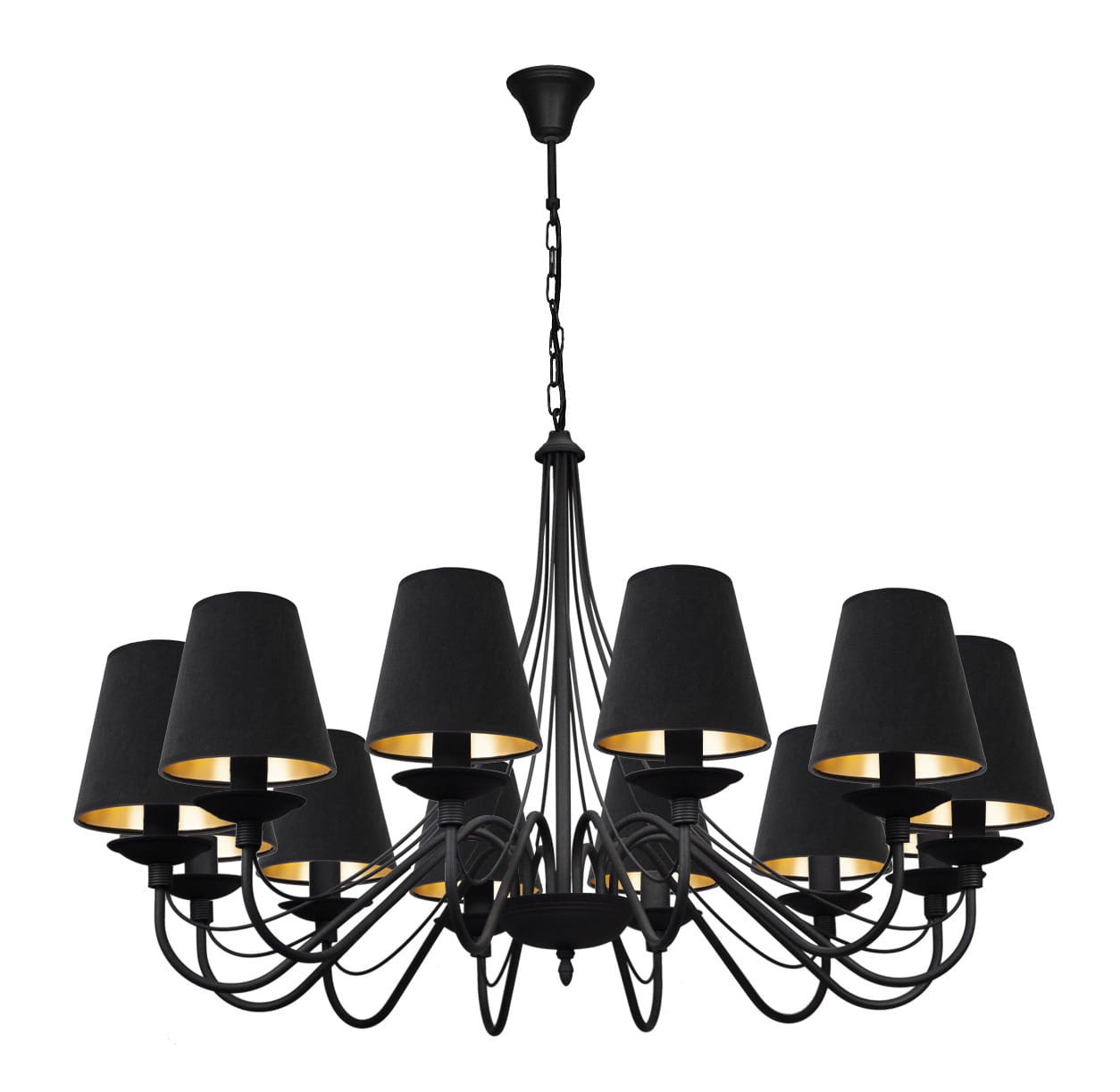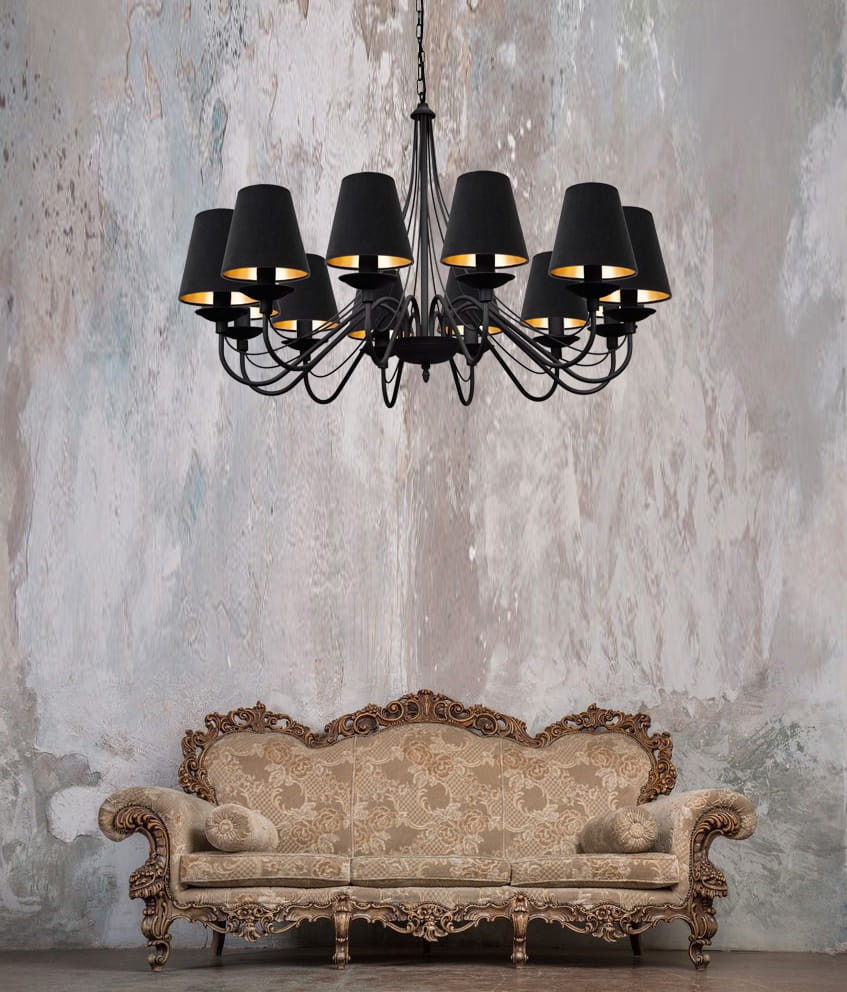 Imponujący żyrandol duży czarny z abażurkami z czarnego weluru ze złotym wnętrzem. Stylowa 12-ramienna lampa sufitowa idealnie sprawdzi się w przestronnym salonie lub dużej restauracji. Klasyczne połączenia czarnego stelaża o ciekawym kształcie i eleganckich abażurów sprawdzi się w wielu aranżacjach.