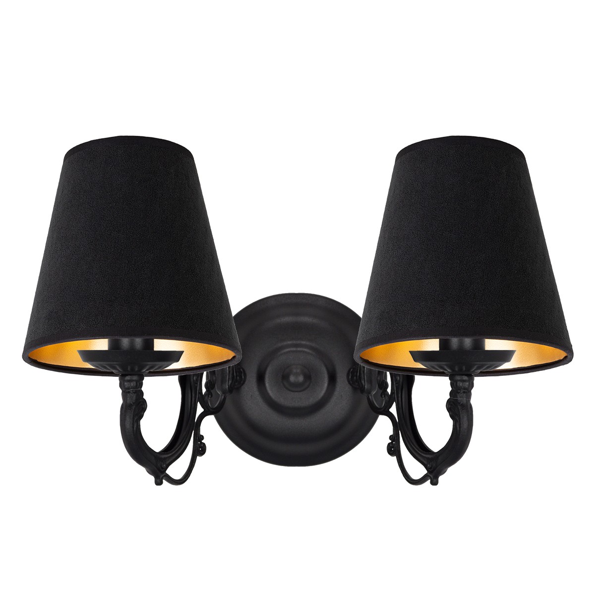 Dwupłomienny kinkiet ścienny z abażurami z czarnego weluru ze złotym wnętrzem, które pięknie odbija światło tworząc przytulny nastrój. Dzięki dwóm punktom światła podkreślisz wybrany fragment ściany lub wyeksponujesz ulubiony obraz. Kinkiet w stylu klasycznym, pasujący do wnętrz tradycyjnych. Lampa wyprodukowana w Polsce.