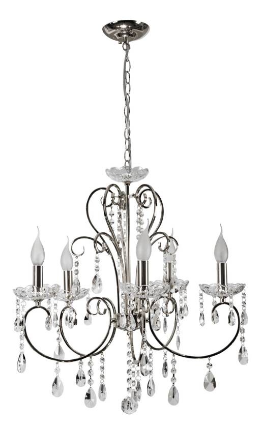 Ekskluzywna lampa wisząca. Ekskluzywna lampa bogato zdobiona pięknymi mieniącymi się i odbijającymi światło kryształami wraz z żarówkami świecznikowymi na srebrzystym stelażu daje w całości niepowtarzalny efekt. Lampa idealnie wpasuje się w klasyczne stylowe aranżacje wnętrz w domu i nie tylko.