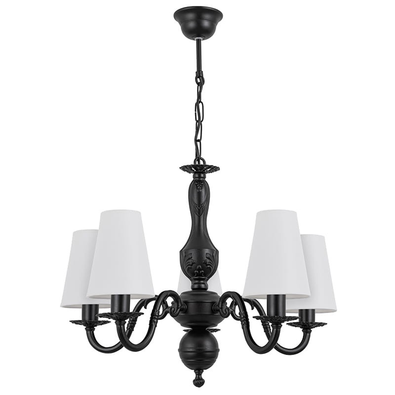 Elegancka czarna lampa wisząca do salonu. Kwintesencja klasycznego stylu- efektowny stelaż o pałacowym rodowodzie zestawiliśmy ze smukłymi abażurkami z białej tkaniny. Ten efektowny żyrandol 5-ramienny doskonale podkreśli wystrój wnętrza, dodając mu szyku. Lampy LALKA wyróżnia niebanalny, niespotykany wygląd, polecamy je zarówno do mieszkań jak i do eleganckich aranżacji restauracyjnych czy kawiarnianych.