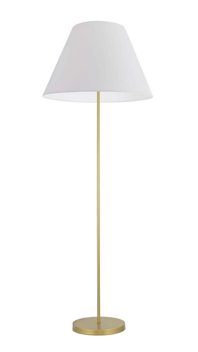 Elegancka złota lampa podłogowa z abażurem z białej gładkiej tkaniny. Stylowa i ponadczasowa. Dzięki prostej nodze pozostanie ozdobą wnętrza przez lata, nie wychodząc z mody. Pasuje do klasycznych aranżacji i będzie ich prawdziwą ozdobą.