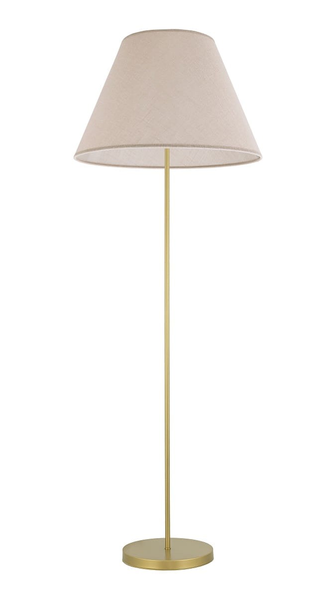 Elegancka złota lampa podłogowa z abażurem z beżowej gładkiej tkaniny. Stylowa i ponadczasowa. Dzięki prostej nodze pozostanie ozdobą wnętrza przez lata, nie wychodząc z mody. Pasuje do klasycznych aranżacji i będzie ich prawdziwą ozdobą.