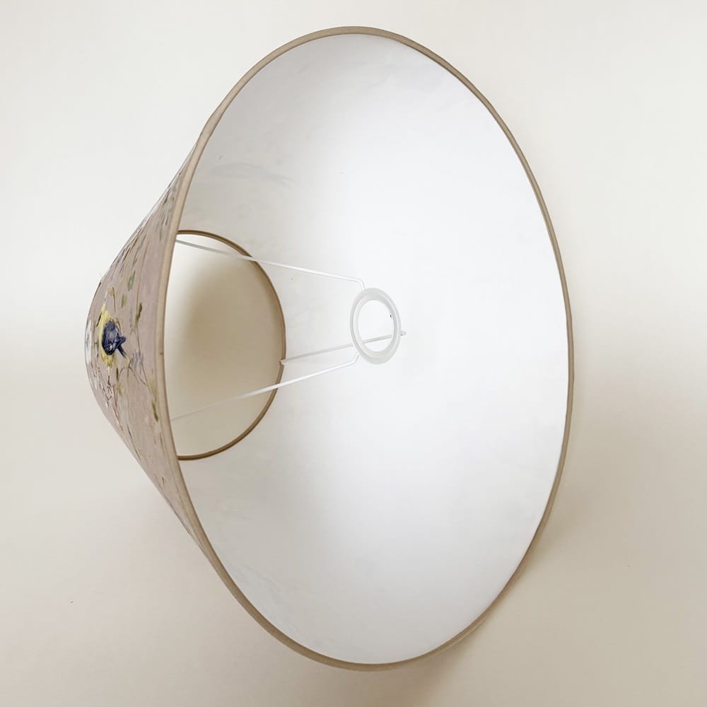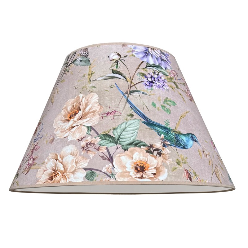 Elegancki abażur do lampy stołowej z beżowego weluru w kwiaty. Abażur w kształcie stożka do lampy podłogowej lub mniejszej lampy stołowej z mocowaniem na oprawkę E27, pięknie wykonany z miękkiego aksamitu podklejonego cieniutką białą pleksi. Przepiękny kwiatowy wzór na beżowym tle zachwyca delikatnością i oryginalnością. Abażur doskonale wpisze się w klimat klasycznych i prowansalskich wnętrz, nadając im ciepła i przytulności.