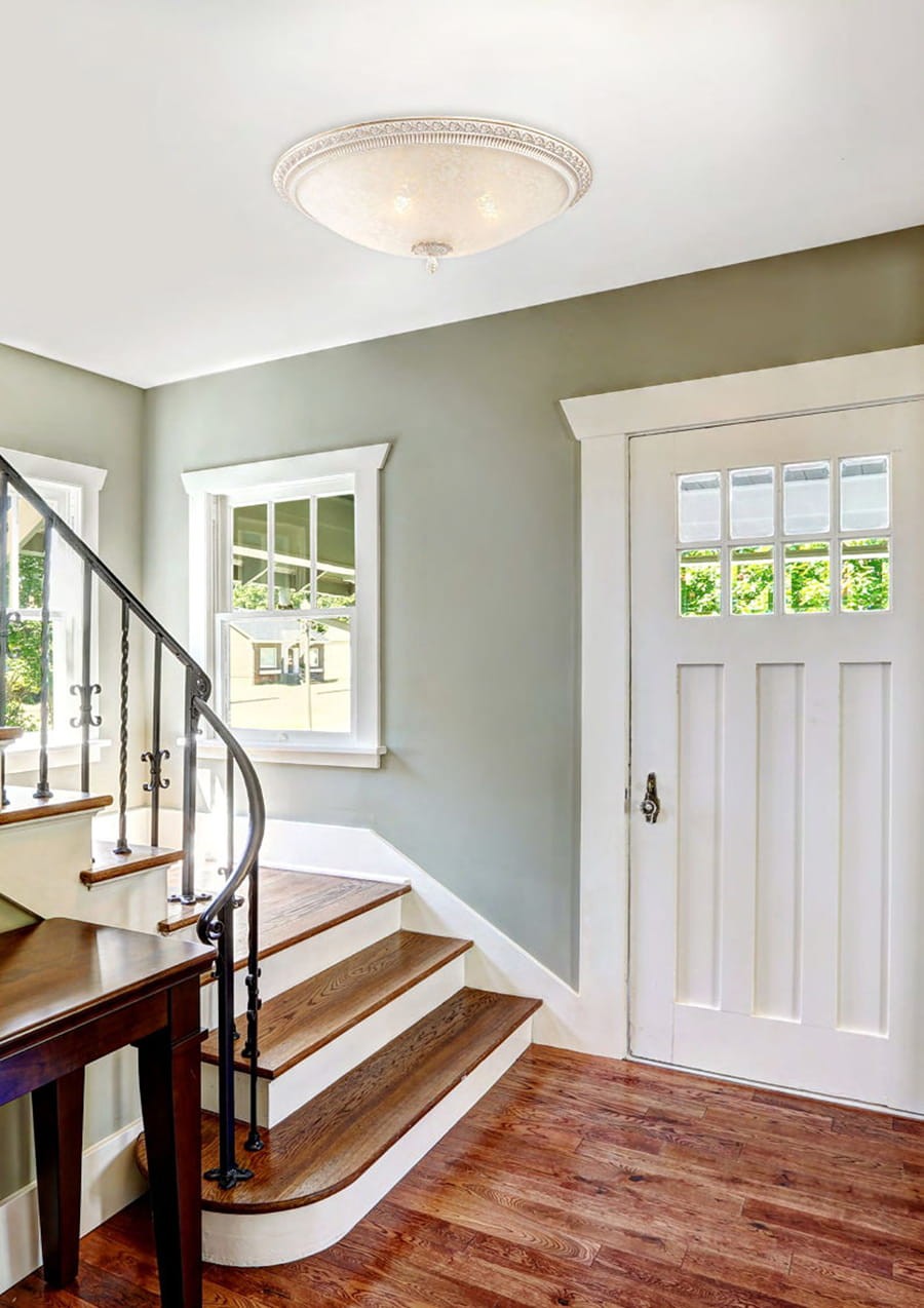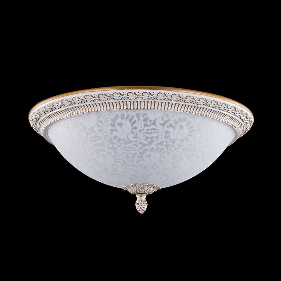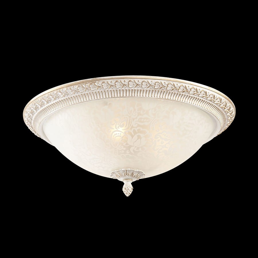 Elegancki biały plafon do salonu. Urokliwy plafon w stylu prowansalskim, znakomity do wnętrz o klasycznym wystroju. Lampa wyróżnia się ciekawym wzornictwem- szklany klosz z piaskowanym motywem roślinnym połączono z rzeźbioną, patynowaną oprawą z metalu. Najwyższej jakości lampa od niemieckiego producenta.