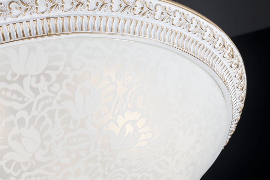 | Materiał | metal malowany na kolor BIAŁY PATYNOWANY ZŁOTEM, szklany klosz z piaskowanym kwiatowym ornamentem |