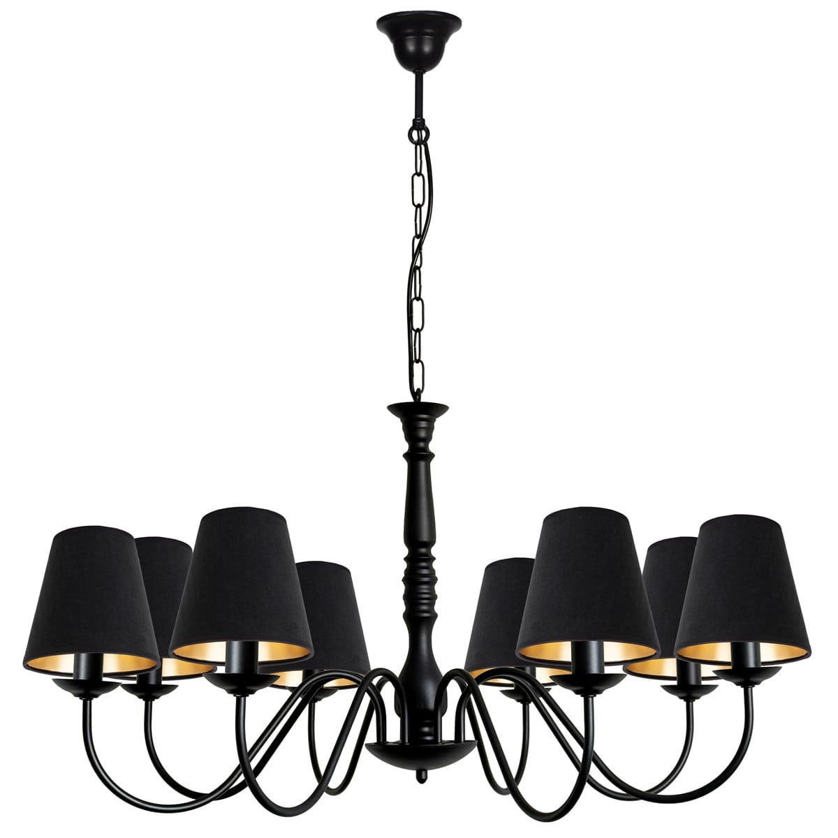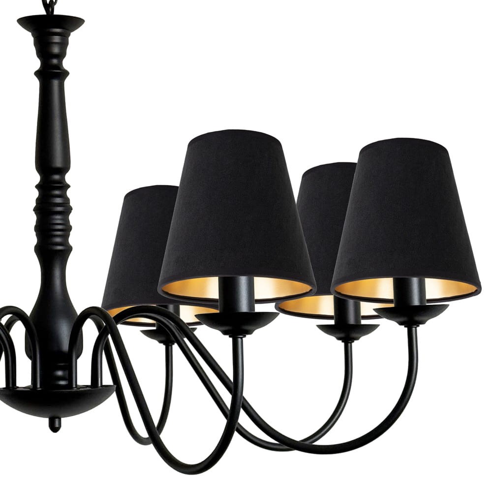 Elegancki czarny żyrandol z serii JASMIN to wyjątkowa propozycja do wnętrz urządzonych w stylu klasycznym, ale sprawdzi się również w nowoczesnych salonach na zasadzie "przełamania" konwencji. Klasyczny 8-płomienny żyrandol zachwyca swoim pięknym stelażem, który składa się ze zdobnego elementu środkowego oraz prostych ramion zakończonych stylowymi abażurami wykonanymi z czarnego, eleganckiego weluru. Metalowy stelaż został pomalowany na kolor czarny, tworząc zgraną całość z abażurkami. Żyrandol sprawdzi się jako oświetlenie nie tylko do dużych salonów ale także do restauracji, czy hoteli. Żyrandol dostępny jest również w wersji z 10 ramionami oraz w kolorach białym oraz stare złoto.