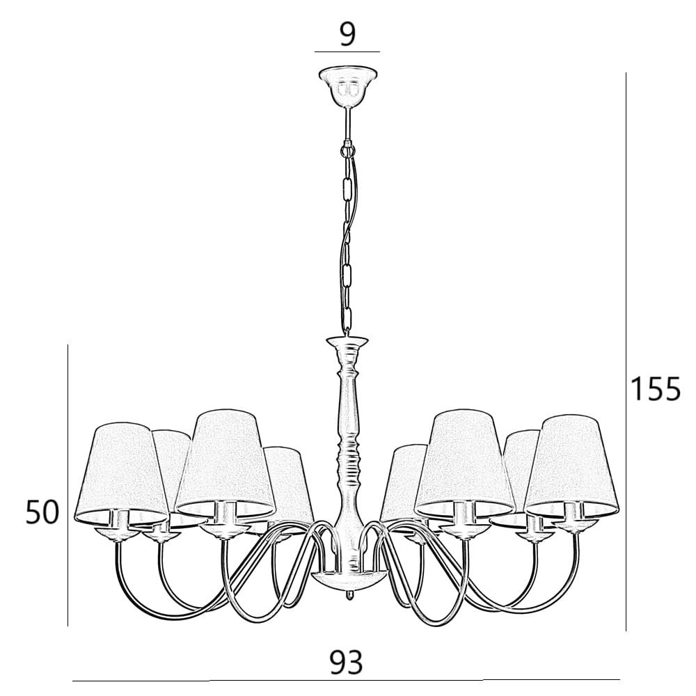 | Wysokość | 155 cm; (możliwość samodzielnego skrócenia łańcucha, długość lampy na 1 oczku 65 cm, na indywidualne zamówienie istnieje również możliwość zamówienia żyrandola z dłuższym łańcuchem) |