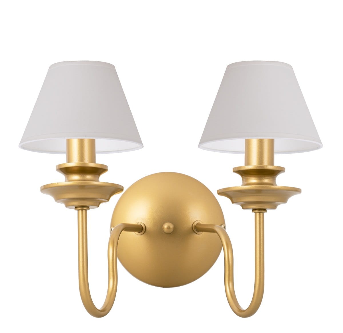 Elegancki kinkiet 2-płomienny KRISTAL. Podwójny stylowy kinkiet z białymi abażurami na pięknym rzucającym się w oczy złotym stelażu będzie idealny do salonu jak i pokoju dziecięcego. Posiada klasyczny wygląd więc będzie pasował do każdej aranżacji. Model kinkietu wyjątkowo gustowny i zachwycający.