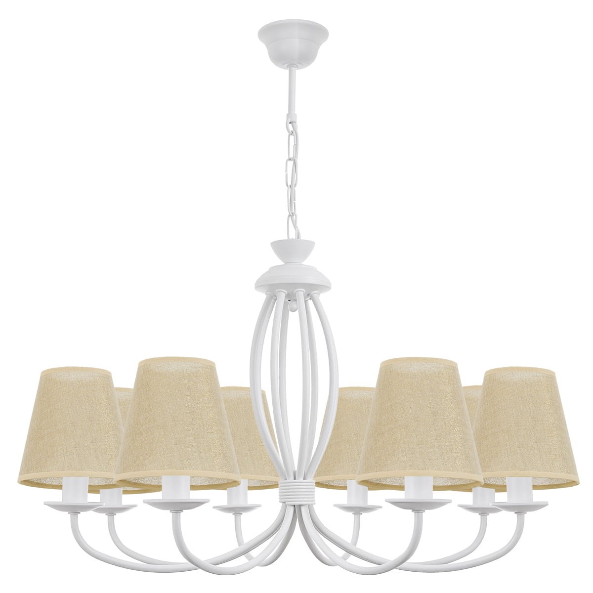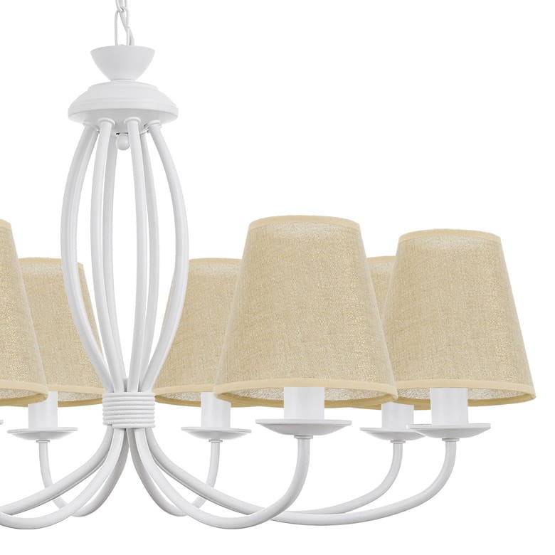 Elegancki klasyczny biały żyrandol OLIVER z ośmioma ramionami to jasna i elegancka lampa sufitowa, idealna do klasycznych wnętrz. Posiada biały stelaż oraz abażury wykonane ze złotego lnu, które wprowadzają naturalny i przytulny klimat. Szeroko rozstawione ramiona dodają lampie lekkości, a połączenie bieli i lnu świetnie sprawdza się w przestrzeniach, gdzie dominuje jasna kolorystyka i naturalne wykończenia. To doskonały wybór do jadalni, salonu lub pokoju dziennego.