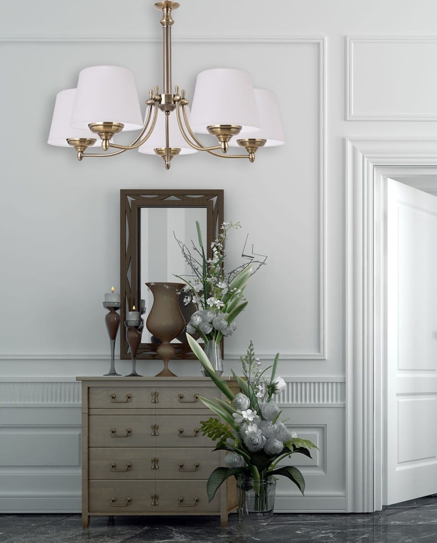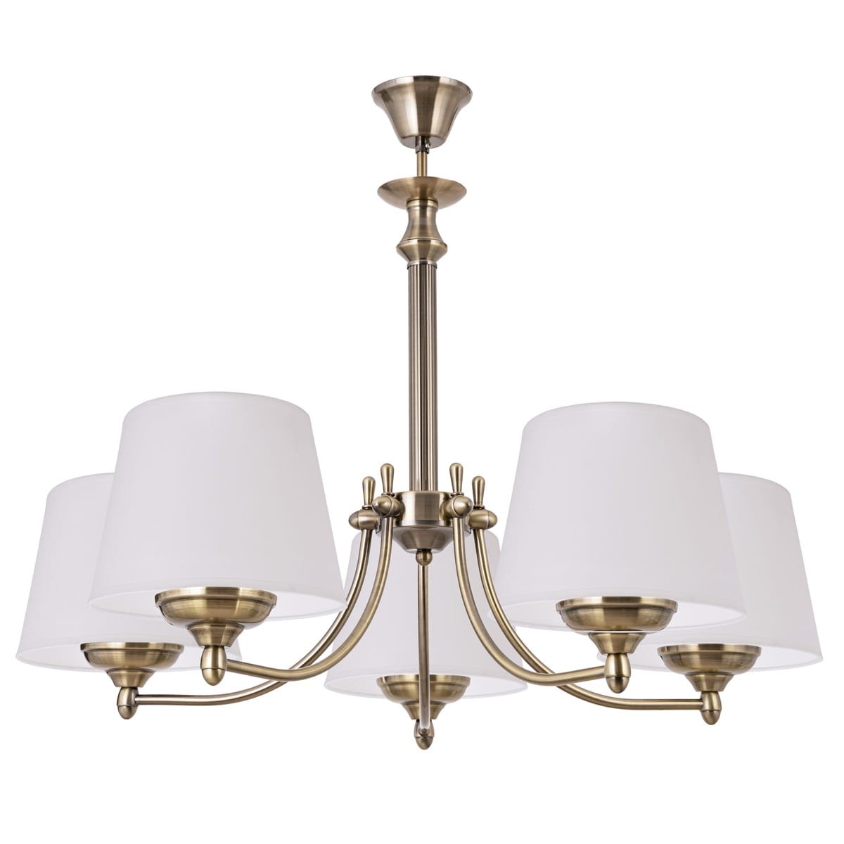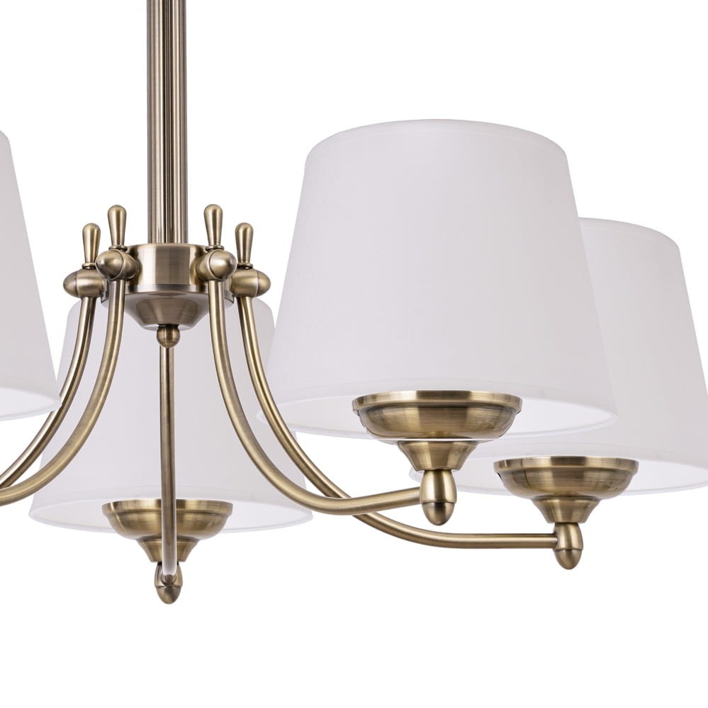 Elegancki klasyczny żyrandol. Klasyczny żyrandol z uniwersalnymi, ponadczasowymi białymi abażurami doda każdemu wnętrzu należytej elegancji. Idealny do salonu, jadalni lub sypialni. Wykonany z certyfikowanych materiałów.