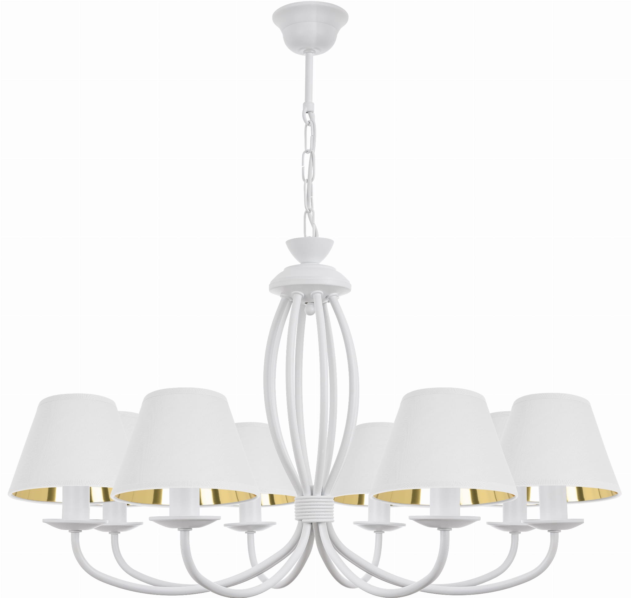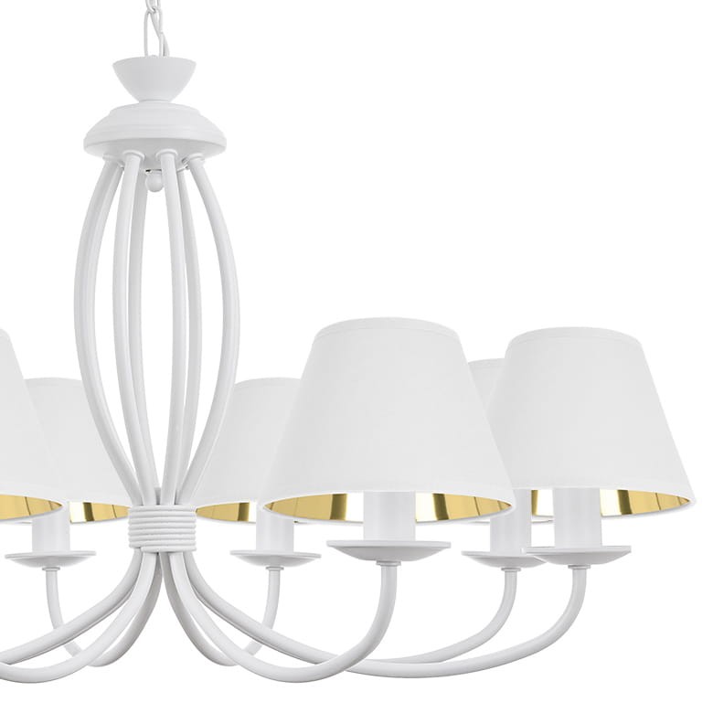 Elegancki stalowy żyrandol biały OLIVER to elegancka lampa sufitowa z ośmioma ramionami, białym stelażem i abażurami w kolorze białym ze złotym, błyszczącym wnętrzem. Jasna kolorystyka w połączeniu ze złotym wykończeniem tworzy stylowy i przyciągający uwagę efekt. Lampa świetnie sprawdzi się w eleganckim salonie lub nastrojowej jadalni, wnosząc do wnętrza blask i klasyczny urok. To doskonały wybór dla osób, które szukają wyrazistego, a jednocześnie subtelnego elementu oświetlenia.