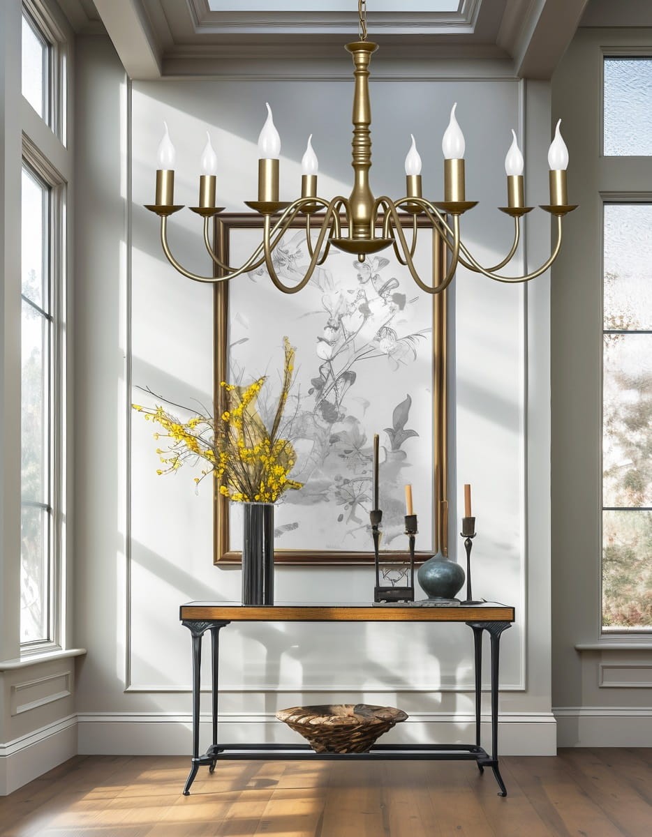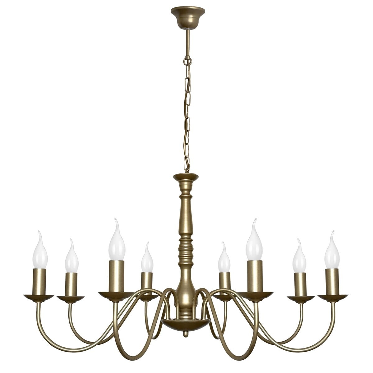 Elegancki, szeroki żyrandol JASMIN z ośmioma punktami świetlnymi, pomalowany elektrostatycznie na kolor starego złota to idealny dodatek do przestronnych wnętrz, urządzonych w stylu klasycznym. Ozdobny środkowy element nawiązuje do stylu pałacowego, a smukłe proste ramiona równoważą tą odważną stylistykę. Doskonałym uzupełnieniem będą tutaj żarówki w kształcie płomyków. Na uwagę zasługuje to, że lampa została w całości wyprodukowana w Polsce.