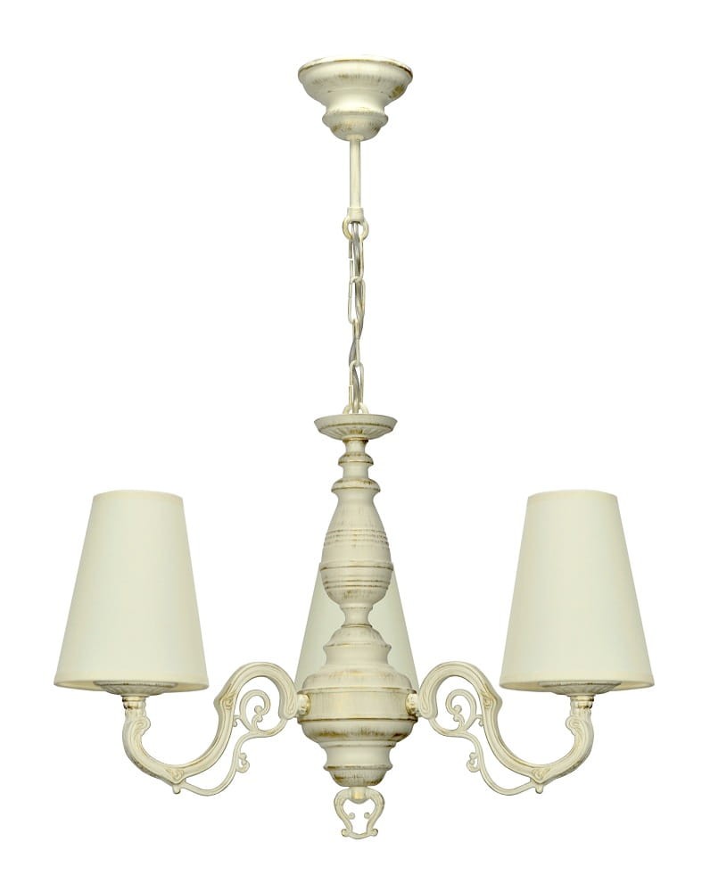 Elegancki żyrandol z abażurami ecru. Bardzo efektowna lampa wisząca do sypialni lub kuchni zachwycająca klasycznym wzornictwem. Połączenie eleganckiej tralki i ozdobnych ramion uzupełniono abażurkami z tkaniny w odcieniu ecru- całość prezentuje się wyjątkowo harmonijnie i elegancko.