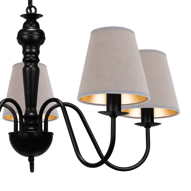 Elegancki żyrandol z beżowymi abażurkami GOLDSUN w stylu angielskim z pięcioma ramionami i abażurami z beżowego weluru to elegancka i klasyczna propozycja do wnętrz z duszą. Ciepły, miękki welur abażurów ociepla surowość czarnego, metalowego stelaża, tworząc harmonijną, przytulną kompozycję. Ma do tego delikatne, złote wnętrze. Lampa doskonale sprawdzi się w salonie, jadalni lub sypialni - wszędzie tam, gdzie ważna jest klasyczna elegancja i domowy klimat.