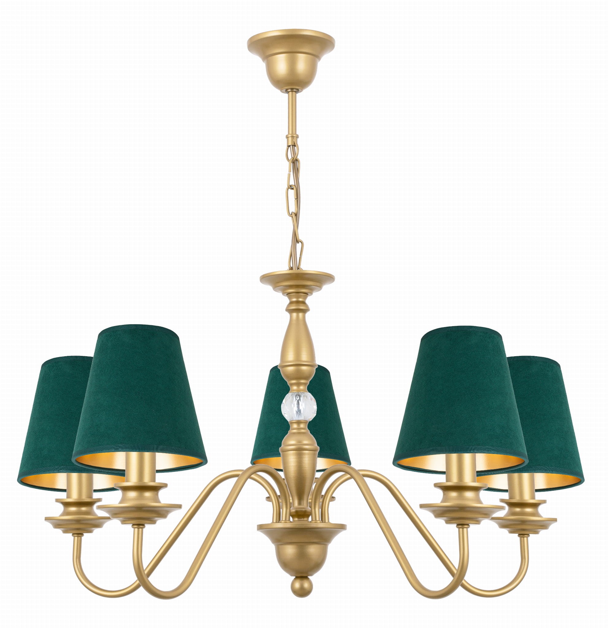 Elegancki żyrandol z zielonymi welurowymi abażurami to wyjątkowo ciekawy model żyrandola. Złoty stelaż wygląda niezwykle elegancko, a dzięki unikatowym zielonym abażurkom z weluru staje się niepowtarzalny. Taka lampa z pewnością będzie idealną ozdobą każdego salonu, sypialni czy jadalni i nie tylko.