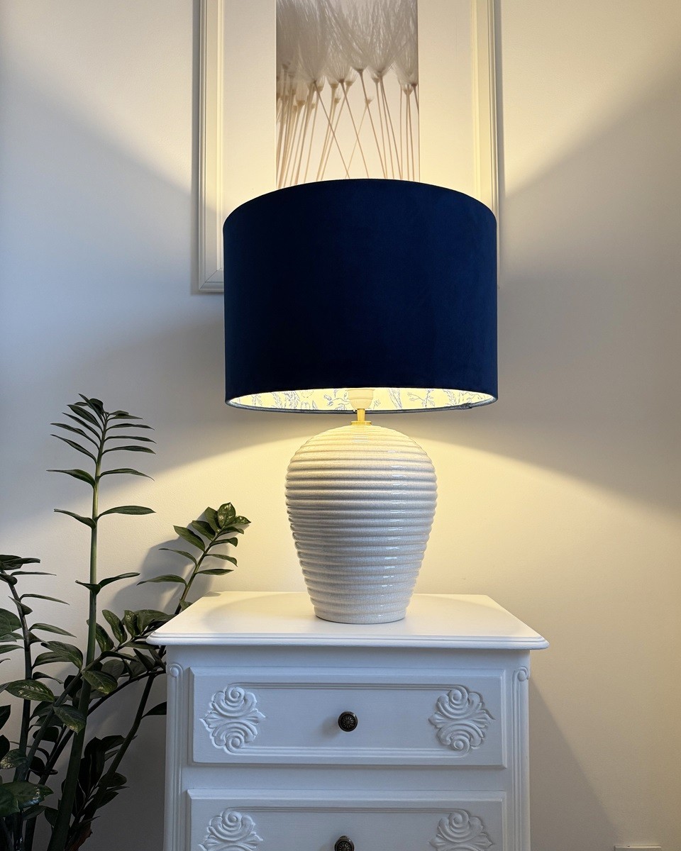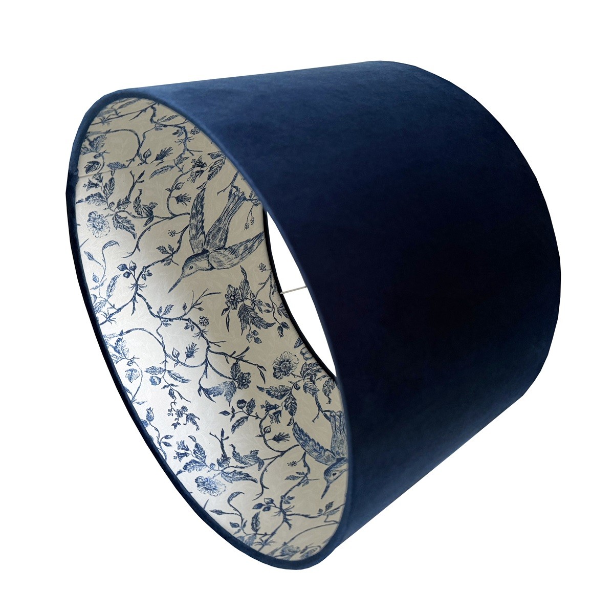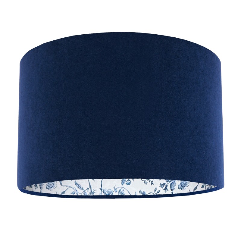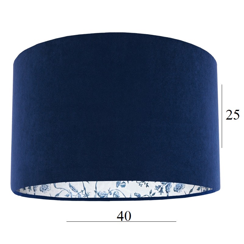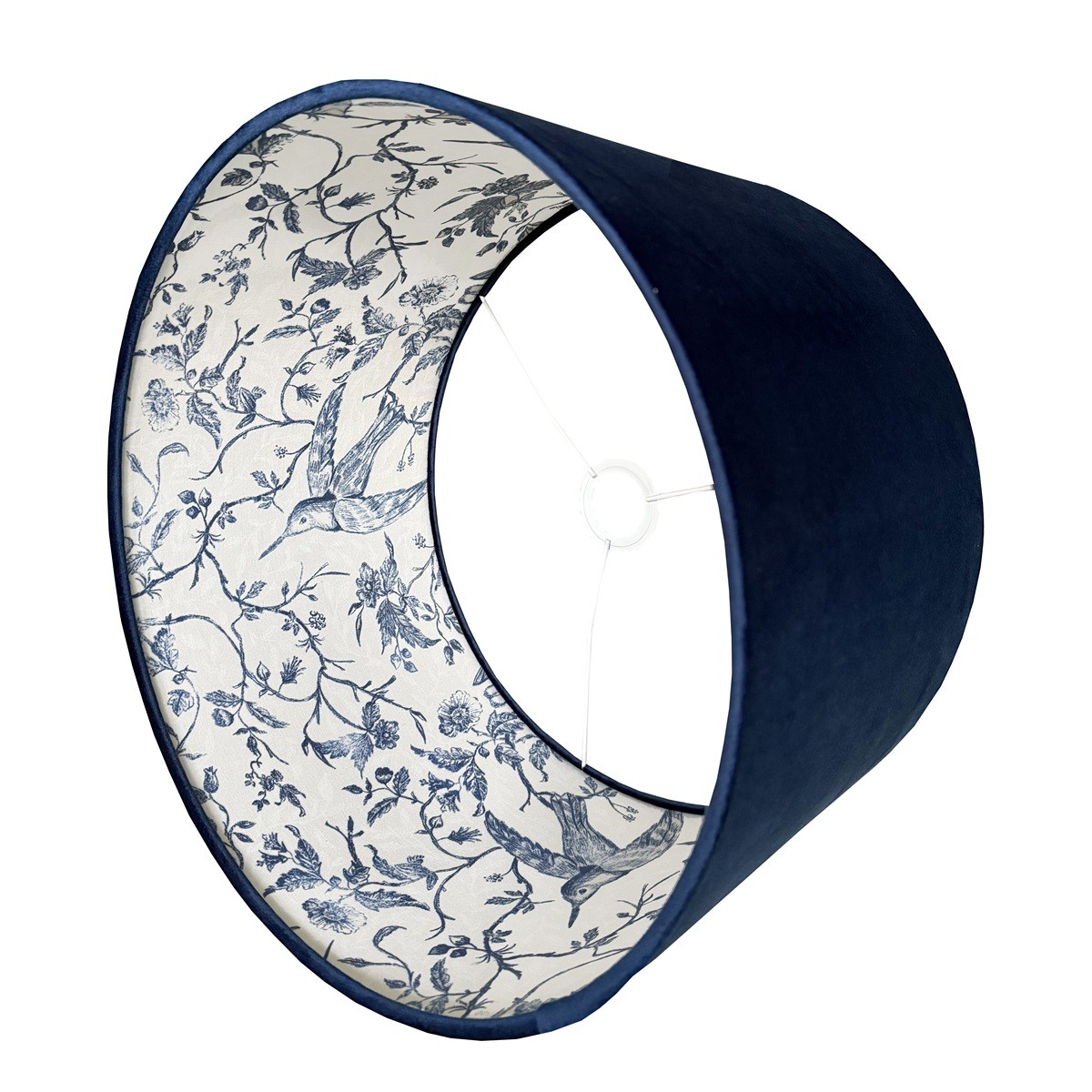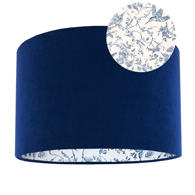 Wnętrze abażura zachwyca starannie dobraną bawełnianą tkaniną, na której znajduje się granatowy wzór kwiatowy oraz ptaszki. Ten dekoracyjny, botaniczny motyw sprawia, że abażur jest bardzo oryginalny i wyjątkowy. Połączenie aksamitnej powierzchni z matowym, wzorzystym środkiem czyni go nie tylko funkcjonalnym elementem oświetlenia, ale także efektowną ozdobą każdego pomieszczenia.
