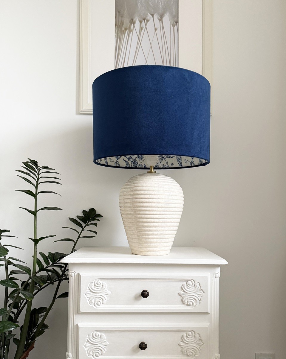 Aksamitny abażur przedstawiony na zdjęciach to wyjątkowy abażur do lampy w kształcie dużego walca o średnicy 40 cm. Jego zewnętrzna tkanina to granatowy aksamit, który nadaje kloszowi luksusowego charakteru i sprawia, że światło rozprasza się w sposób miękki i nastrojowy. Ten abażur z aksamitu doskonale podkreśla wystrój nowoczesnych wnętrz, a także aranżacji glamour, klasycznych czy hampton.