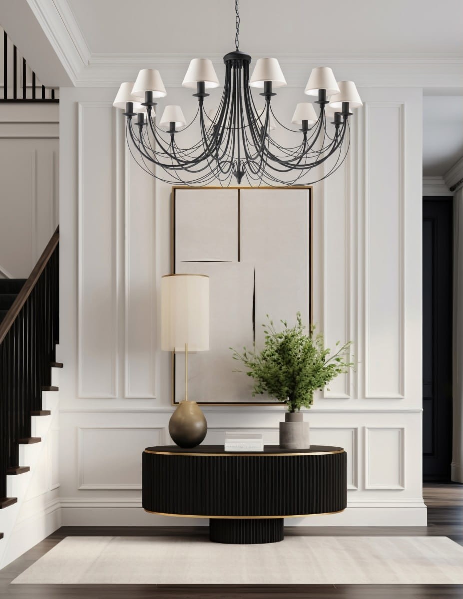 Prezentujemy Państwu naszą ekskluzywną dużą lampę do salonu, która będzie stanowić zarówno praktyczne źródło światła, jak i stylowy element dekoracyjny. Jej stelaż został wykonany z solidnego czarnego materiału, dodając elegancji każdemu wnętrzu. Natomiast abażury w pięknym kolorze ecru nadają oświetleniu przytulny, delikatny charakter.