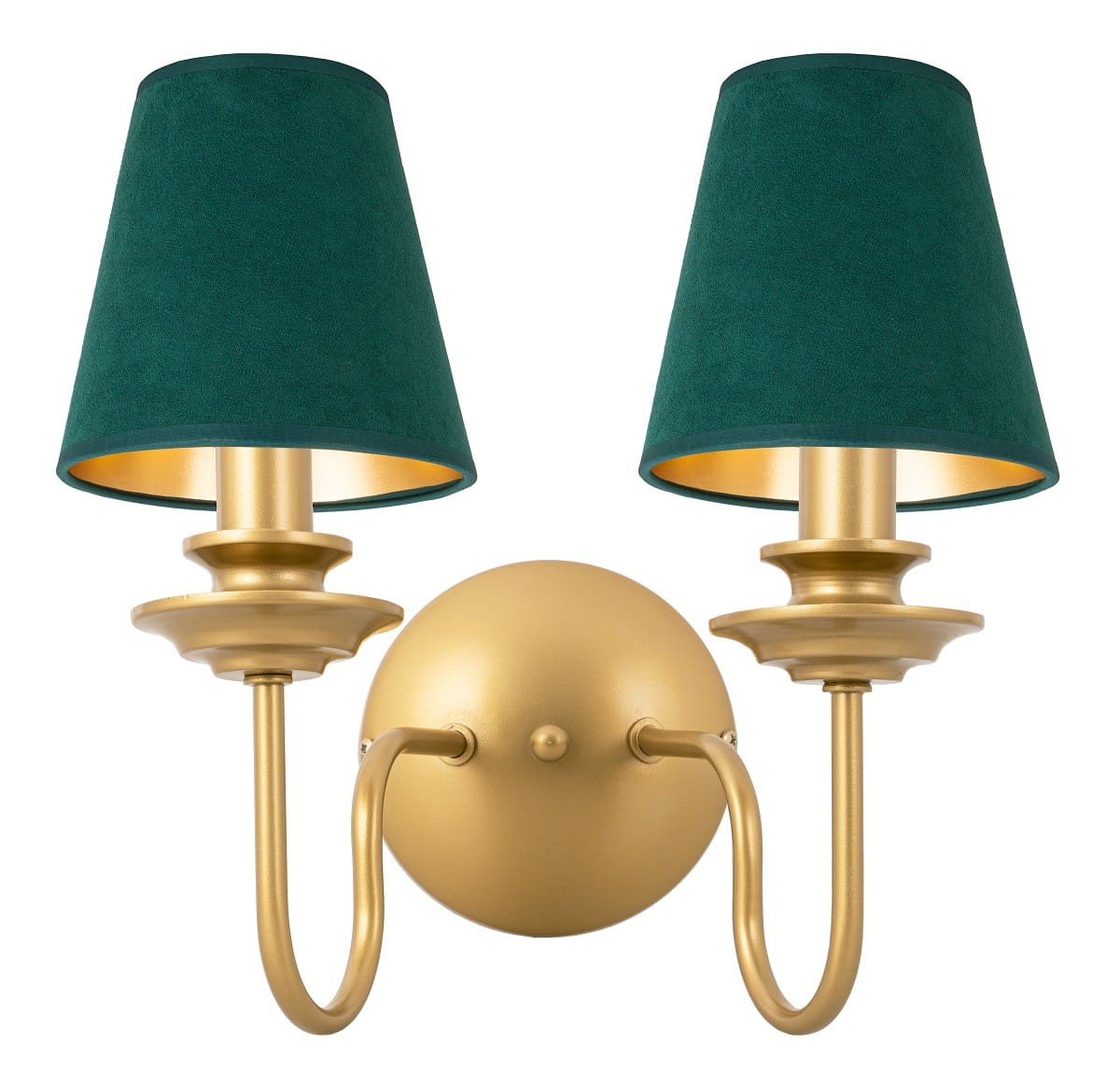 Kinkiet podwójny do salonu z zielonymi abażurami. Szykowny,elegancki podwójny kinkiet ścienny zachwyca swoją precyzją wykonania oraz dizajnem. Wykonany z produktów najwyższej jakości. Posiada unikatowe zielone abażurki zamontowane na oryginalnym złotym stelażu. Idealnie wpasuje się każdego salonu, sypialni czy jadalni i nie tylko.