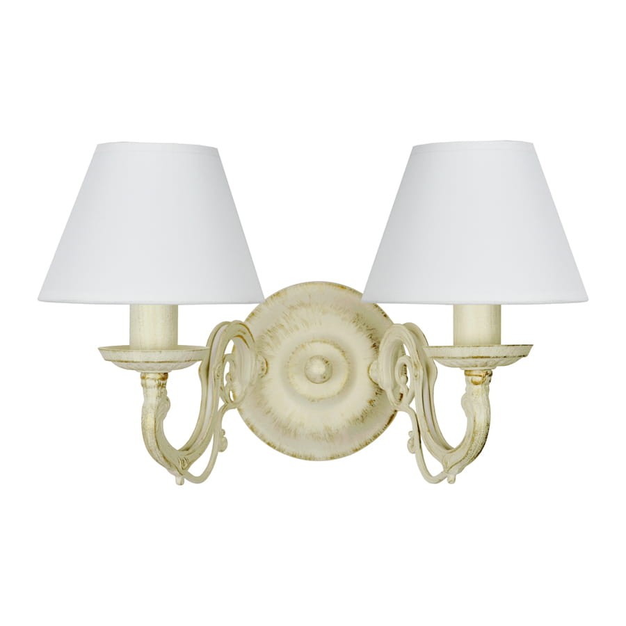 Kinkiet prowansalski. Stylowy podwójny kinkiet ze zgrabnymi, białymi abażurkami z tkaniny. Lampa prezentuje się wyjątkowo efektownie. Dzięki dekoracyjnemu stelażowi i efektownej kolorystyce łączącej ecru i złoto kinkiet robi duże wrażenie. Znakomita lampa do sypialni, zachwyca wzornictwem i jakością wykonania.