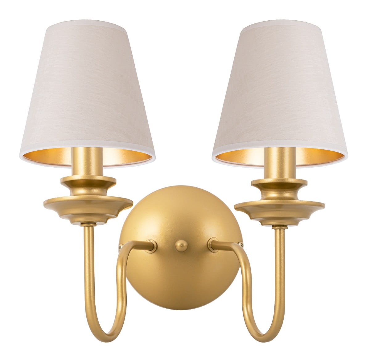 Kinkiet w stylu klasycznym to wyjątkowa podwójna lampka ścienna, zachwyca swoją precyzją wykonania oraz dizajnem. Posiada piękne stylowe abażurki zamontowane na oryginalnym złotym stelażu. Taki kinkiet z pewnością będzie ozdobą każdego salonu, sypialni czy jadalni.