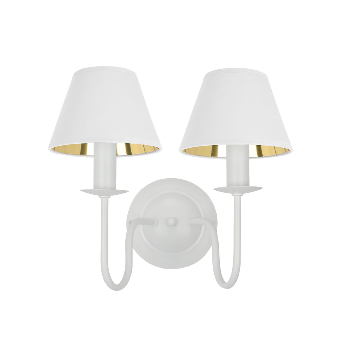 Klasyczna elegancka lampka ścienna biało-złota GOLDSUN do klasycznych wnętrz z białymi abażurami i złotym wnętrzem to stylowa i efektowna lampa ścienna, która łączy lekkość z elegancją. Jasna, neutralna zewnętrzna część kloszy kontrastuje ze złotym wnętrzem, które odbija światło, nadając mu ciepły, przyjemny blask. Kinkiet świetnie sprawdzi się w eleganckim holu, salonie lub jako oświetlenie nad lustrami w sypialni, wprowadzając do wnętrza subtelny i ciepły nastrój.