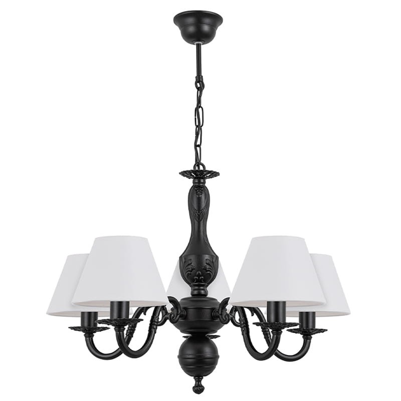 Klasyczny czarny żyrandol do salonu. Efektowny czarno-biały żyrandol 5-ramienny, wzorowany na tradycyjnych żyrandolach pałacowych. Żyrandol LALKA zachwyca klasycznym pięknem- zgrabna tralka ozdobiona kwiatowym ornamentem została zestawiona z subtelnymi ramionami i ażurowymi detalami. Całości dopełniają zgrabne abażurki z białej tkaniny. Lampa została wykonana z ogromną dbałością o szczegóły, spełni oczekiwania najbardziej wymagających klientów będąc prawdziwą ozdobą wnętrza.