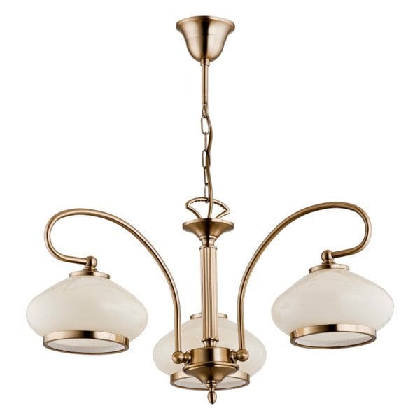Klasyczny potrójny żyrandol do pokoju. Bardzo stylowy w eleganckim wydaniu żyrandol utrzymany w cieszącym się popularnością klasycznym stylu. Stelaż w pięknym odcieniu patyny zestawiono ze zgrabnymi szklanymi mlecznymi kloszami. Idealny dodatek do tradycyjnych aranżacji. Wysoka jakość od polskiego producenta.