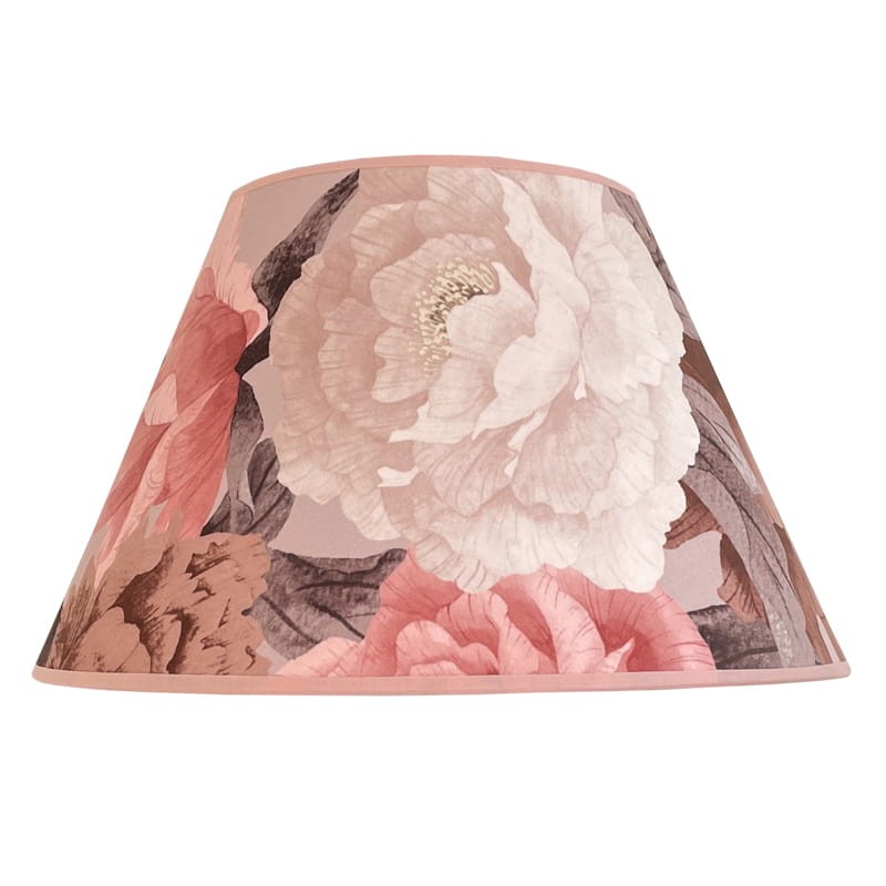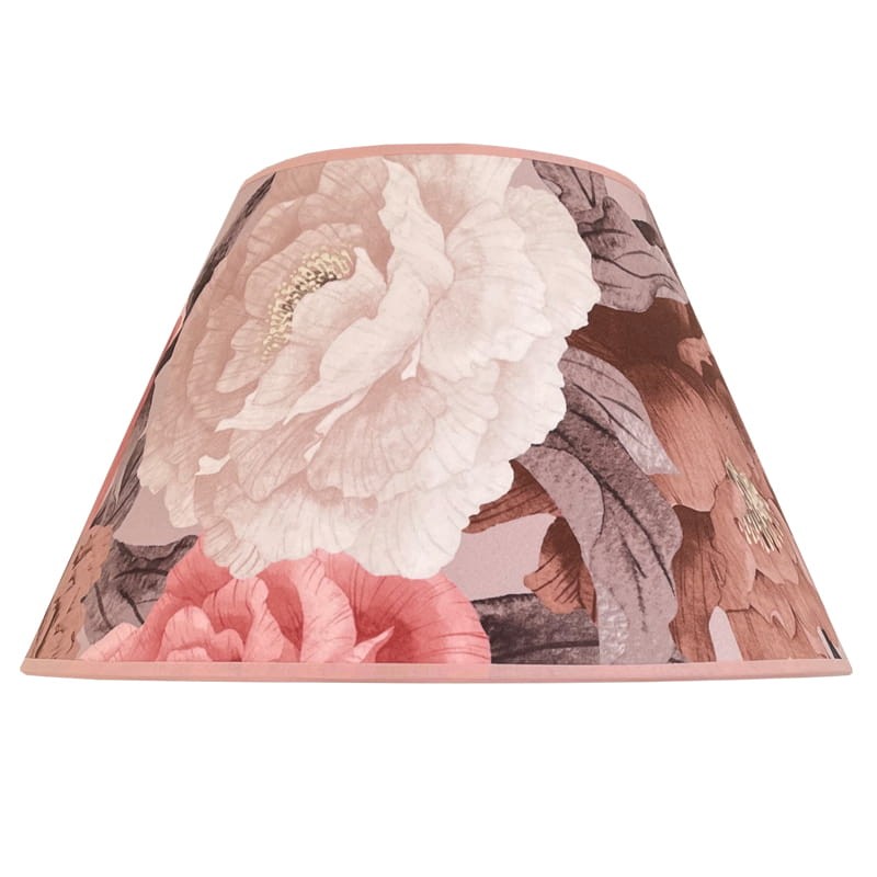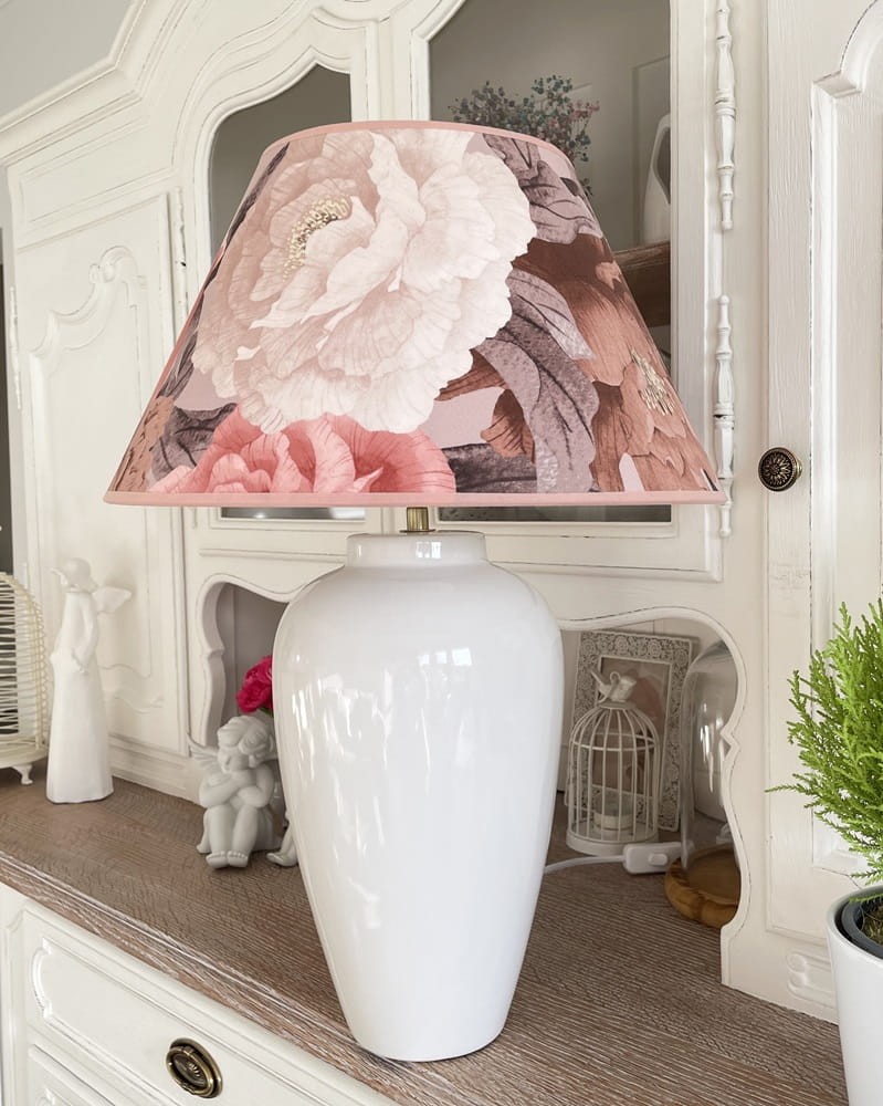 Klosz do lampy z tkaniny z wzorem kwiatowym z DELIKATNEGO WELURU podklejonego cieniutką białą pleksi. Przepiękny delikatny kwiatowy wzór piwonii w kolorach różowym, kremowym i brązowym zwraca uwagę i stwarza romantyczny nastrój we wnętrzu. Abażur doskonale wpisze się w klimat klasycznych i prowansalskich wnętrz, nadając im szyku i przytulności.