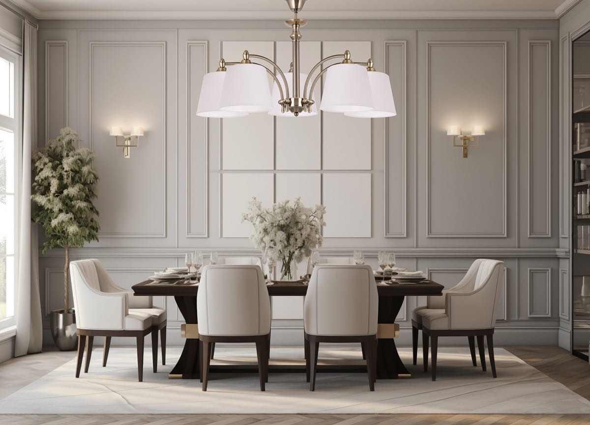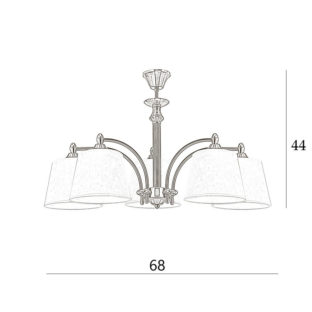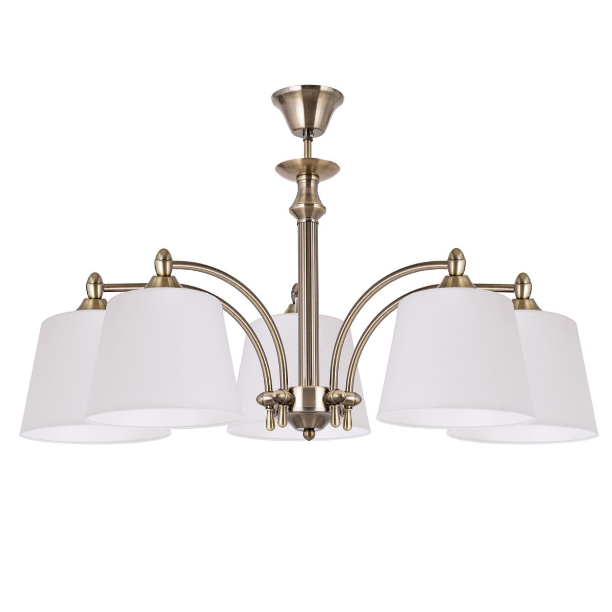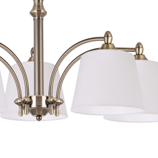 Krótki klasyczny żyrandol do salonu CAMELIA 5-ramienny. Ten elegancki żyrandol z uniwersalnymi, ponadczasowymi białymi abażurami doda każdemu wnętrzu należytej elegancji, jego dodatkowym atutem, jest możliwość zawieszenia w niskich pomieszczeniach. Białe, zgrabne abażury kierują światło w dół, dobrze oświetlając przestrzeń. Idealny do salonu, jadalni lub sypialni. Wykonany z certyfikowanych materiałów.