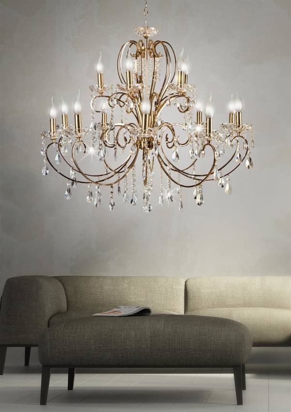 Kryształowy złoty żyrandol. Duży okazały żyrandol bogato zdobiony pięknymi mieniącymi się i odbijającymi światło kryształami wraz z żarówkami świecznikowymi daje w całości niepowtarzalny efekt. Lampa idealnie wpasuje się w duże przestronne pomieszczenia takie jak kościoły restauracje czy hotele. Świetnie prezentuje się również w centralnym miejscu w salonie w domu.