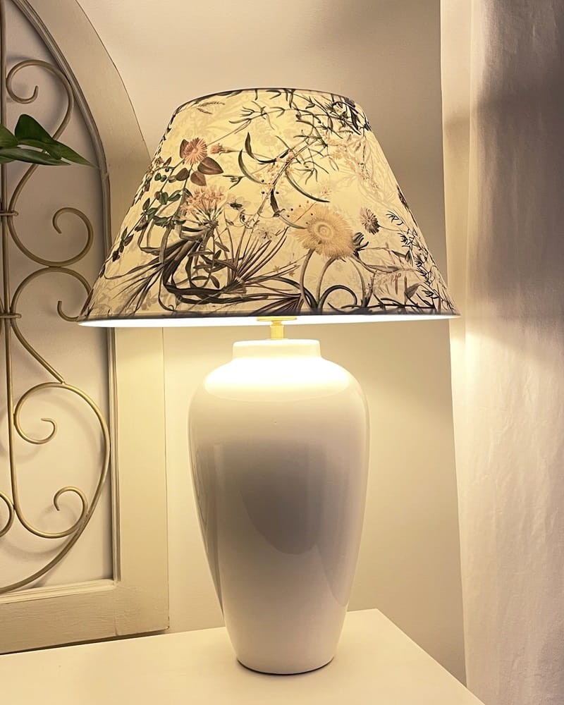 Kwiecisty abażur do lampy z przyjemnego w dotyku białego WELURU podklejonego cieniutką białą pleksi. Przepiękny delikatny wzór jesiennej łąki w kolorach różowym, zielonym i szarym zwraca uwagę i stwarza romantyczny nastrój we wnętrzu. Klosz do lampy, który doskonale wpisze się w klimat klasycznych i prowansalskich wnętrz, nadając im szyku i przytulności.