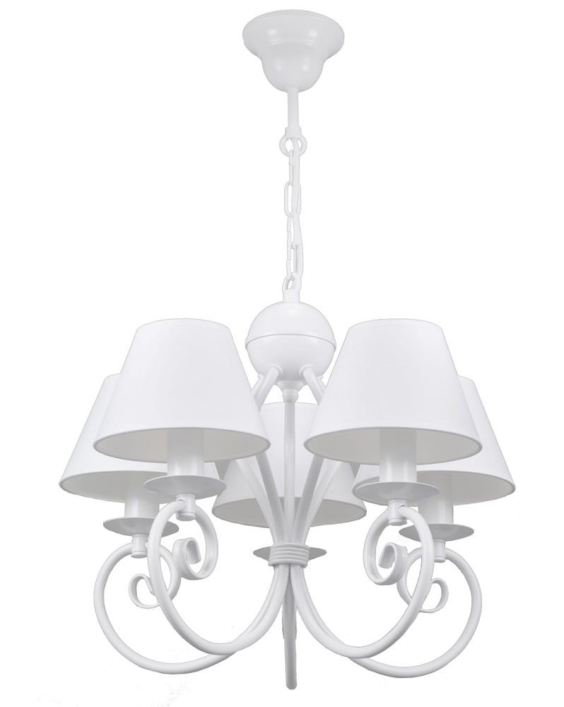 Klasyczny żyrandol to znakomite oświetlenie do jasnych wnętrz w stylu prowansalskim czy shabby chic. Stelaż 5- ramiennej lampy wiszącej wykonany jest z metalu, dzięki swojemu ciekawemu kształtowi dodaje jej niesamowitego charakteru. Całość dopełniają abażurki wykonane z wysokiej jakości tkaniny, które dodadzą Twojemu salonowi przytulności i uroku.